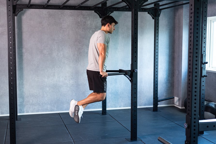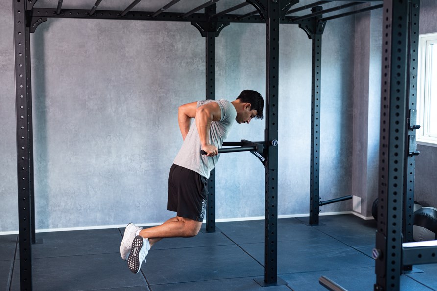 • Brug en lang elastik til at få lidt hjælp med at løfte kroppen op. Elastikken fastgøres nemt på dipsstativet, hvorefter du placerer det ene knæ på elastikken for at få trækassistance opad, når du laver dine dips.