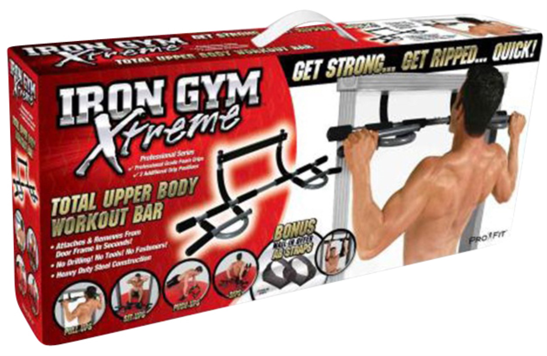 Iron Gym Xtreme er en multifunktionel træningsstang til pull-ups, chin-ups, sit-ups, arm- og skulderøvelser samt enhver anden øvelse, som du har brug for til at opbygge en kraftig overkrop. Iron Gym Xtreme har flere forskellige håndtag som øger muligheden for variation. Instruktionsbog, monteringsværktøj, træningsprogram og ernæringsguide medfølger.