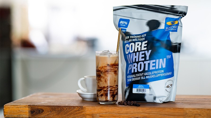 Tip! Bland de forskellige smagsvarianter af Core Whey Protein for en lækker variation, for eksempel en halv skefuld Vanilje og en halv skefuld Cappuccino.