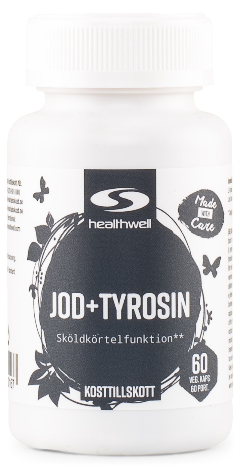 Healthwell Iodine+Tyrosine er et supplement med mineralet jod og aminosyren tyrosin i vegetabilske kapsler. Både jod og tyrosin er vigtige for skjoldbruskkirtlens normale funktion og danner tilsammen skjoldbruskkirtelhormonet thyroxin. Du doserer blot 1 kapsel dagligt med et måltid. Vegansk tilskud med vegetabilske kapsler.