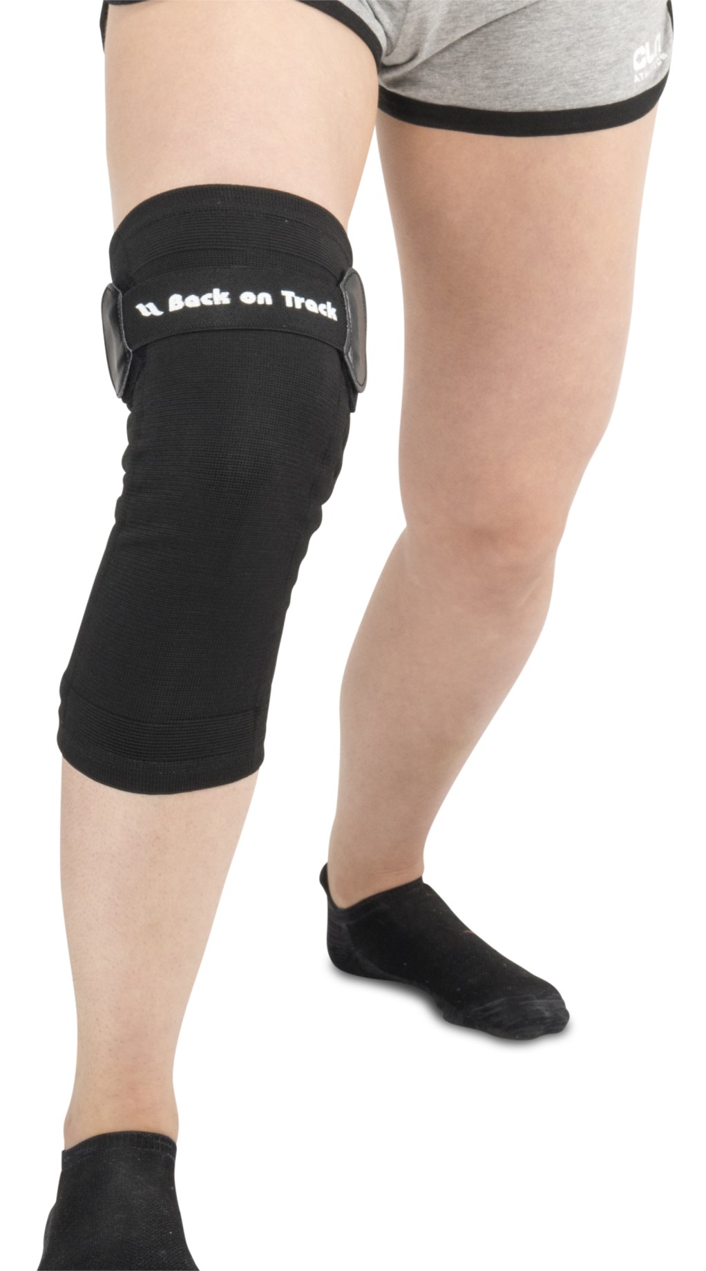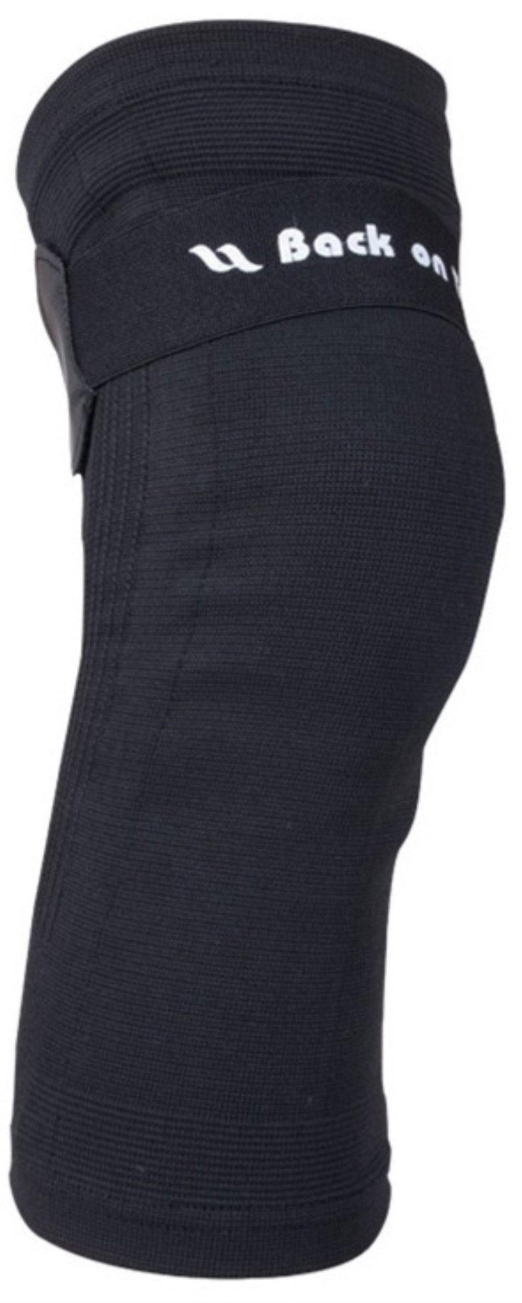 Denne har et justerbart spænde i overkanten. Det er en elastisk bandage, som holdes på plads af elastik/velcro. Elastikken kan spændes, når du motionerer og afspændes, når du hviler. Man kan også fjerne den, hvis man vil sove med bandagen på. Hvis du har et knæ der hæver, kan spændet være en ekstra hjælp.
