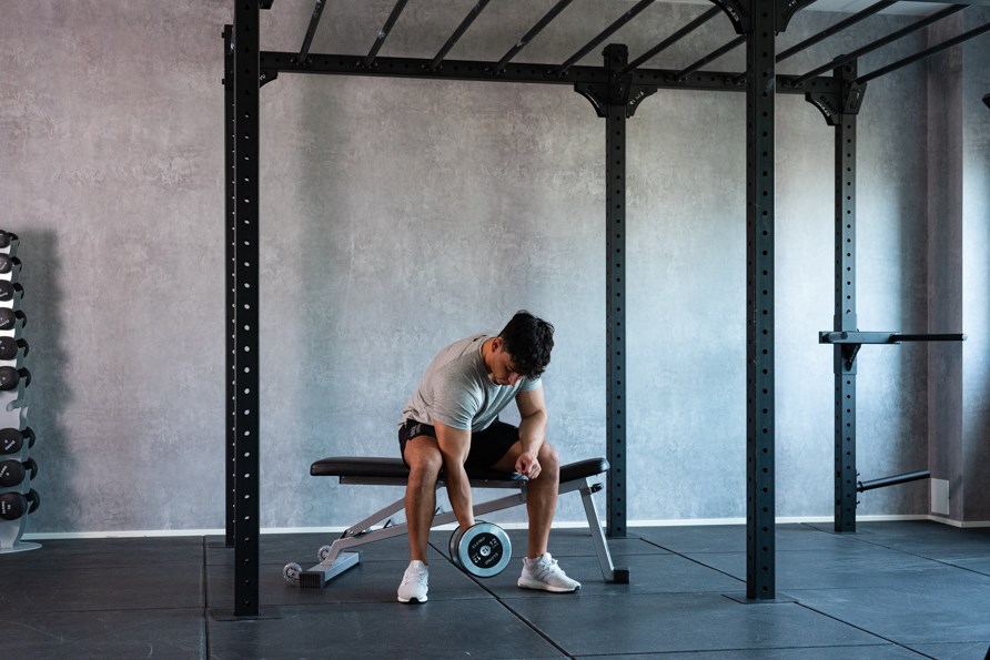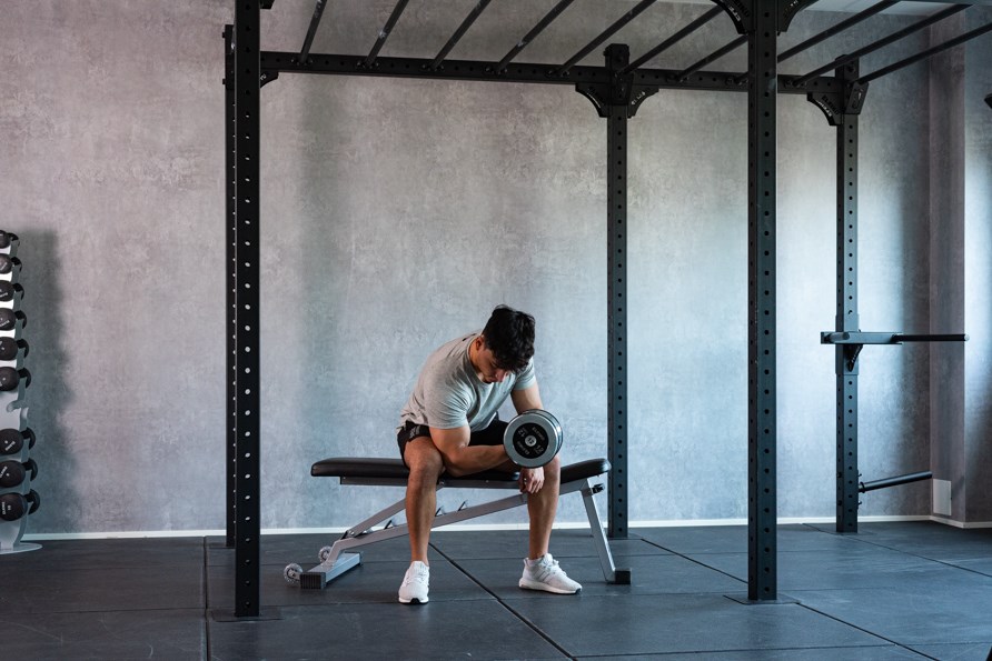 Koncentrationscurls er en øvelse, der er svær at svinge og snyde sig igennem. Her låser vi albuen fast mod låret, hvilket betyder, at al fokus lægges på biceps, så et tip er at gå lidt ned i vægt på håndvægtene i denne øvelse.