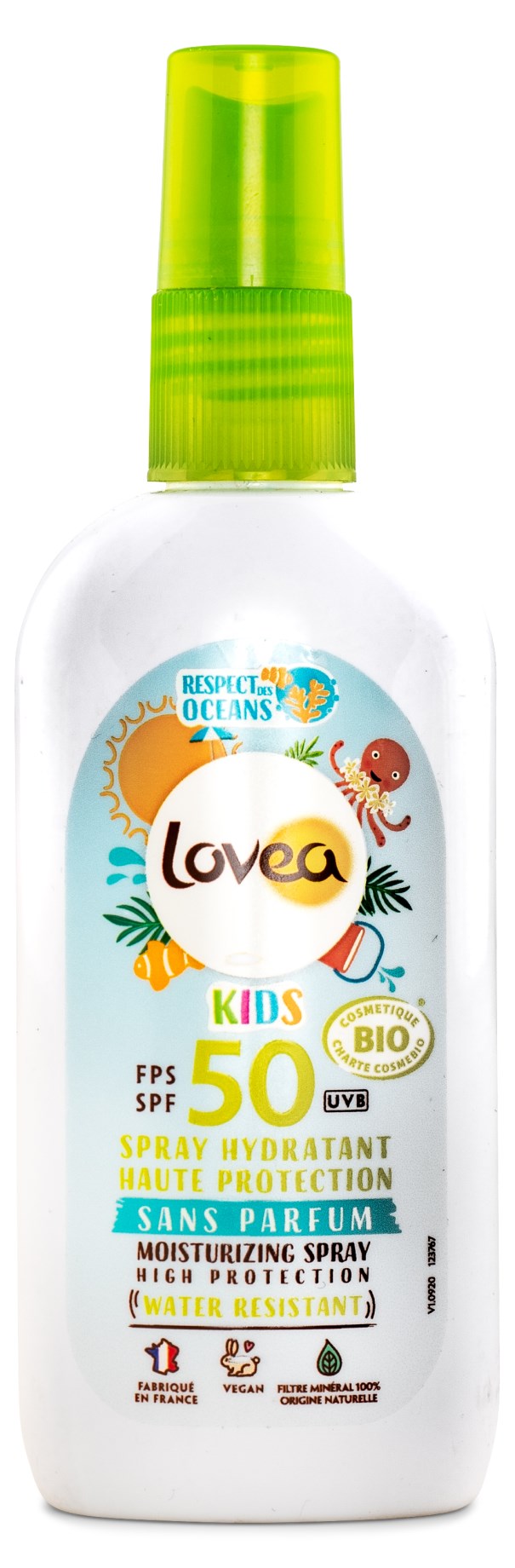 Lovea ORGANIC KID High Protection Moisturizing Spray SPF50 er en solbeskyttelse til børn med høj SPF. Den både beskytter og fugter barnets hud. Solsprayen indeholder et 100% fysisk solfilter, der effektivt beskytter huden mod solens farlige UVA/UVB-stråler. Flasken er også dekoreret med Disneys figurer. Til børn over 3 år.