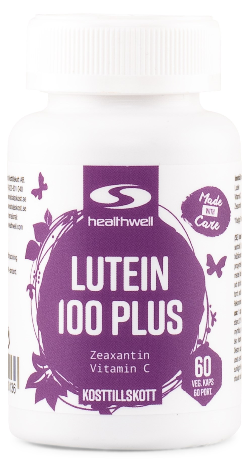 Healthwell Lutein 100 Plus er et omhyggeligt formuleret kosttilskud, og indeholder udover lutein også blåbærekstrakt og C-vitamin. Blåbæret, vores nordiske superbær, er spækket med sunde næringsstoffer, mineraler og vitaminer. Ligesom morgenfruen indeholder blåbær lutein, men også flavonoider som anthocyaniner. Disse menes at hjælpe med at beskytte A-vitaminet i øjet mod at blive nedbrudt. C-vitamin er til gengæld en kraftig antioxidant, der beskytter kroppens celler mod frie radikaler, og dermed modvirker oxidativt stress.