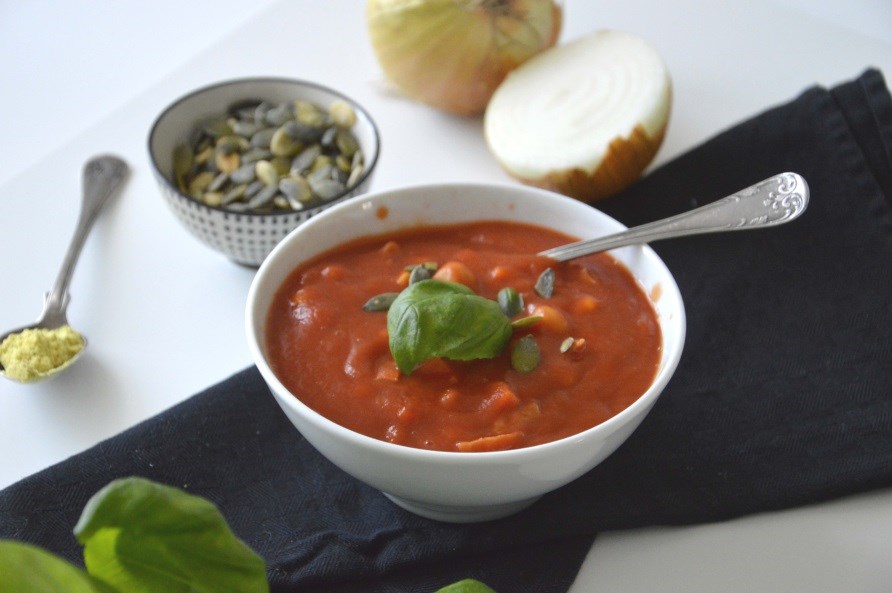 Bland vand og flåede tomater i en gryde. Bring det i kog og sænk derefter varmen. Tilsæt nudler, løgblanding og kyllingestykker, og lad det koge i nogle minutter. Smag til med urtesalt og server.