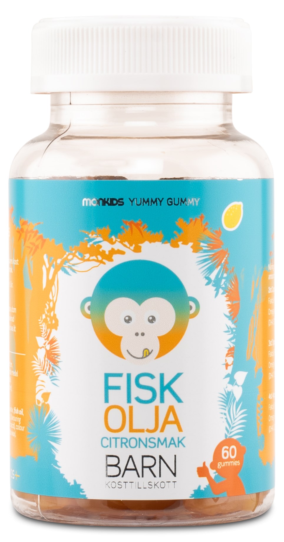 Med Monkids fiskeolie vil det være let at give barnet et dagligt supplement af de vitale omega-3-fedtsyrer. Monkids fiskeolie er gelé tyggetabletter, der forestiller små fisk og med en god smag af citron. Tabletternes farve kommer naturligt fra frugt og grøntsager. Da fiskeolien i Monkids Fiskeolie er mikroindkapslet, vil der ikke komme nogen bismag når man tygger geléfiskene.