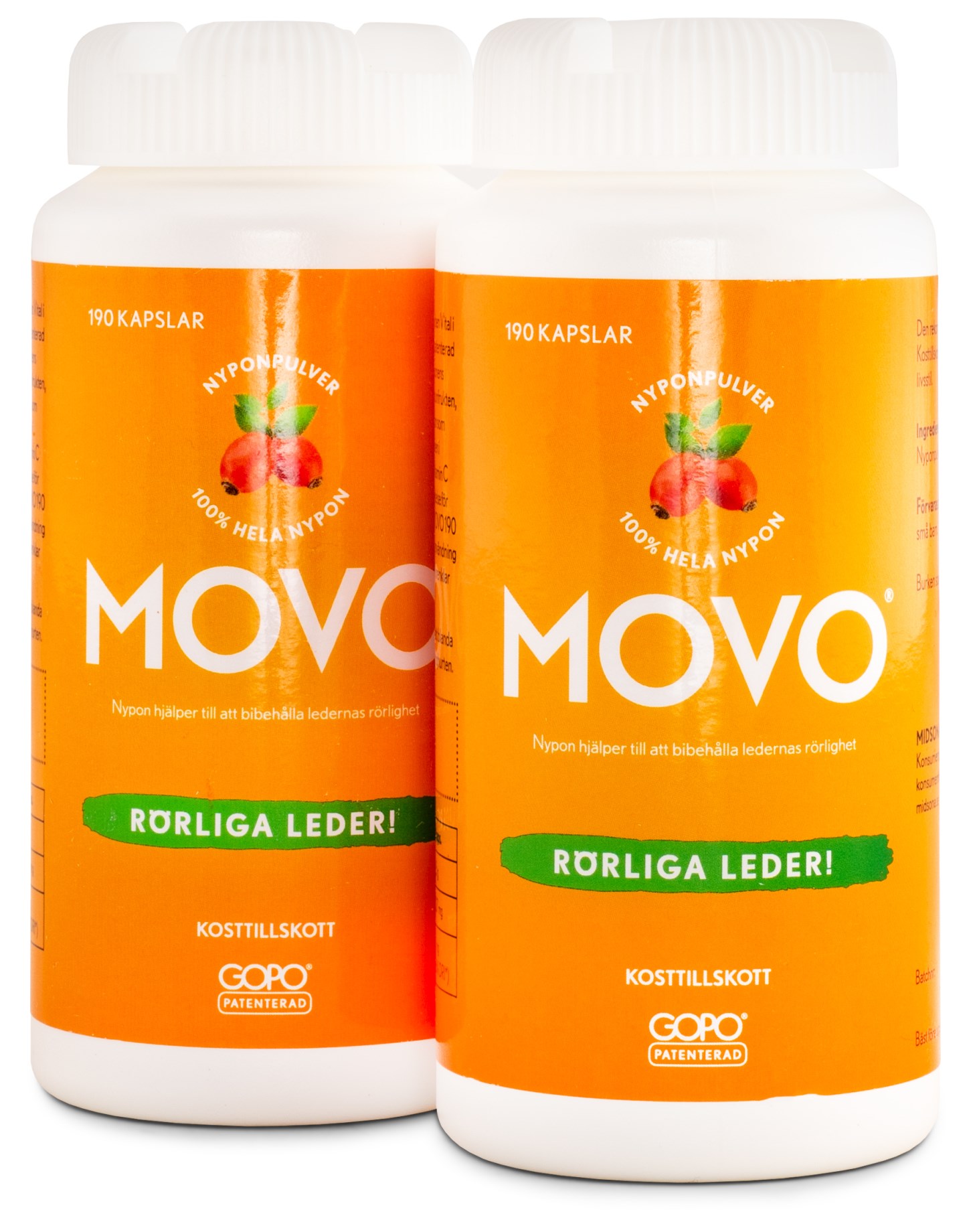 MOVO hybenkapsler i dobbeltpakning indeholder rent hybenpulver og har et rigt indhold af aktive stoffer, der er nyttige for kroppen. Blandt andet er hybenpulver et naturprodukt, der er blevet populært til fremme af ledsundhed. Hyben i sig selv har også et højt naturligt indhold af vitamin C. Hybenpulveret i kapslerne er omhyggeligt tilberedt gennem en patenteret tørringsproces kaldet GOPO®. Brug MOVO kapsler dagligt for at opretholde naturlig ledmobilitet.