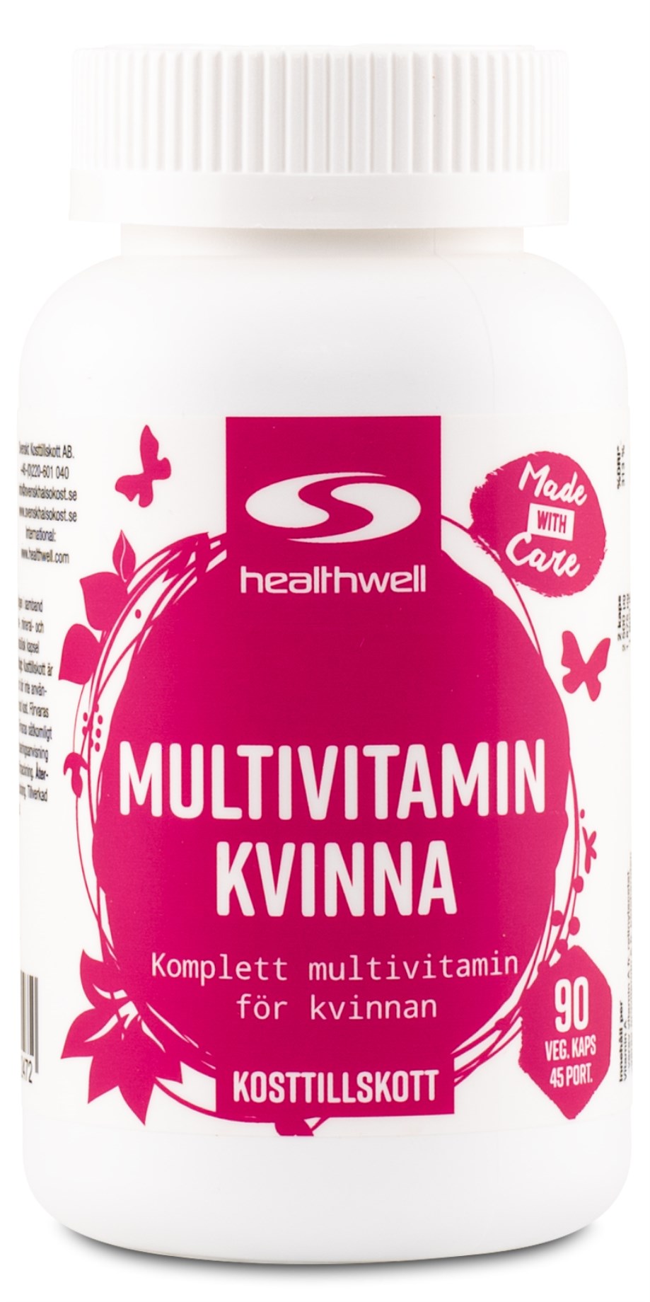 Multivitamin Kvinde fra Healthwell er et komplet multivitamin- og mineraltilskud, med særligt udvalgte vitaminer og mineraler, som kvinder har brug for. Disse kapsler er ekstra højdoserede med udvalgte vitaminer, mineraler, frugt- og planteekstrakt, som på forskellige måder er interessante for kvinder. Multivitamintilskuddet er rigt på jern, så der kan dannes røde blodlegemer til at transportere ilten rundt i blodet, samt C-vitamin, og sammen hjælper de med at opretholde et normalt fungerende immunsystem. Healthwell Multivitamin Kvinde er desuden forstærket med biotin, så hud og hår bibeholder den normale kvalitet, og en normal energiomsætning og omsætning af mikronæringsstoffer opretholdes.