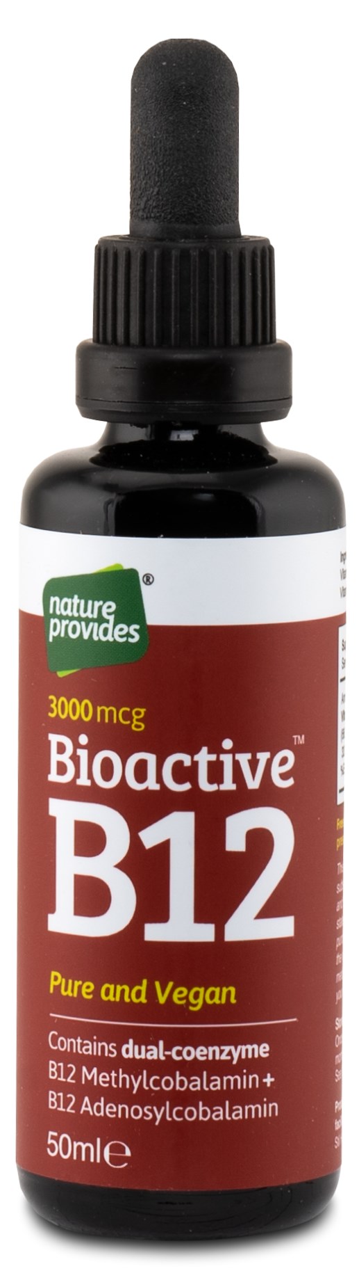 Nature Provides Bioactive B12 er en kraftfuld og biotilgængelig blanding, der indeholder de mest aktive former for B12-vitamin, coenzym methylcobalamin og adenosylcobalamin. Tilskuddet indeholder ingen konserveringsmidler eller farvestoffer og er kun blandet med renset vand.