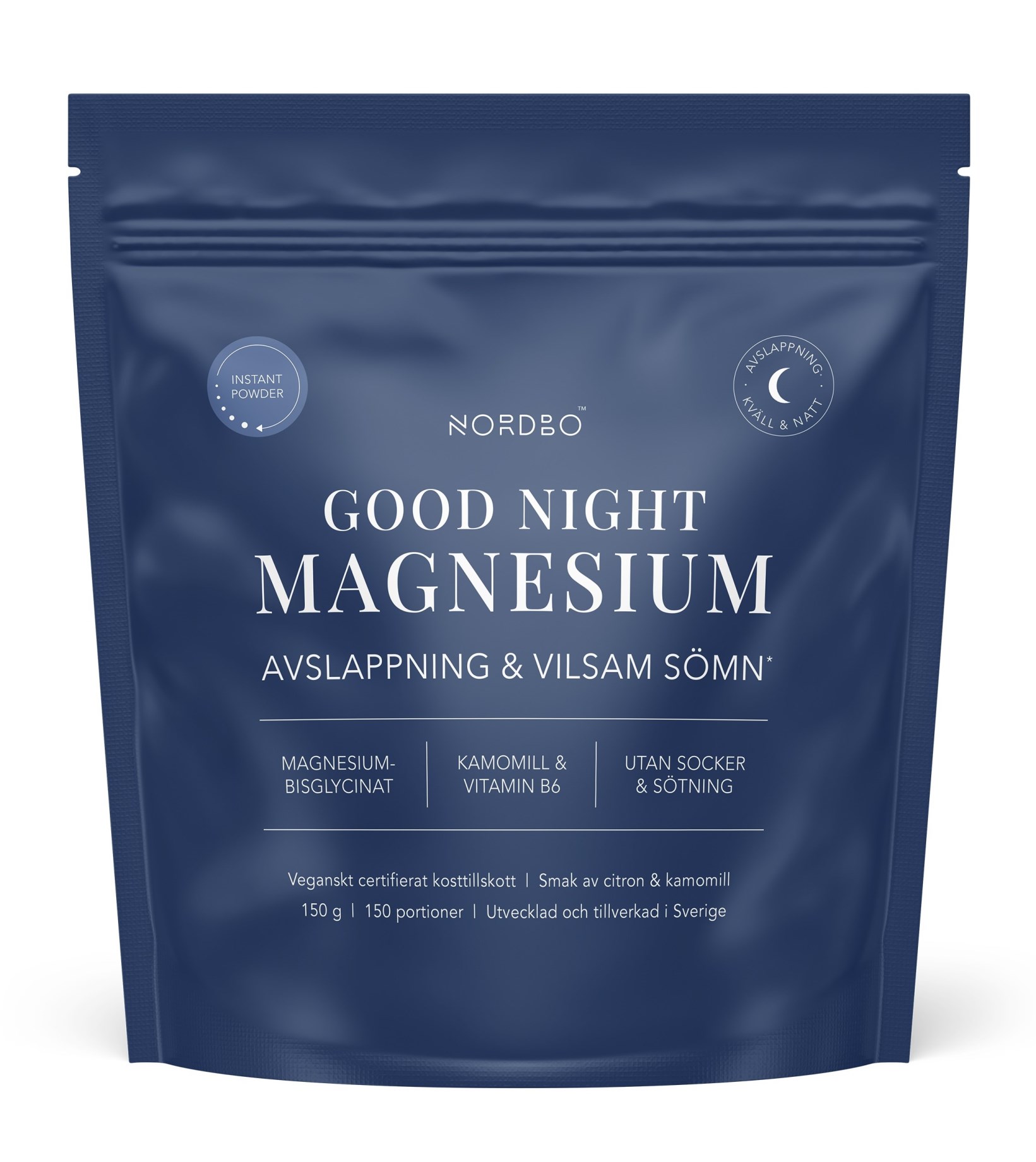 Nordbo Good Night Magnesium Instant Pulver er specielt udviklet til at bruges om aftenen før nattesøvnen. Et letopløseligt pulver med magnesiumbisglycinat sammen med kamilleekstrakt og vitamin B6, smagssat med naturlig citrussmag. Fri for øvrige tilsætningsstoffer og sødemidler. Magnesium bidrager til normal nerve- og muskelfunktion og hjælper med at reducere træthed og udmattelse. Brug som et dagligt tilskud, bare bland i valgfri kold væske.