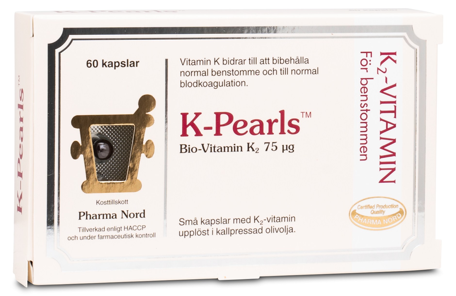 Pharma Nord K-pearls er små runde kapsler, med det fedtopløselige K2-vitamin. K-vitamin hjælper blandt andet med koagulation, så blodet kan koagulere korrekt. Vitaminet regulerer også calciumniveauerne i kroppen og interagerer med D-vitamin for en normal knoglestruktur. Pharma Nord K-pearls indeholder tilsat koldpresset olivenolie for optimal optaglese. Kapslerne er små og lette at synke, men kan også tygges for dig, der har svært ved at synke kapsler eller tabletter.