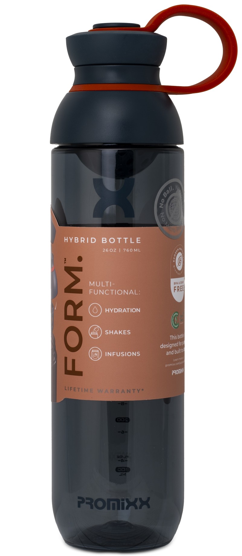 PROMiXX Form Hybrid Bottle er en praktisk, funktionel flaske til både hverdag og træning. Den er fremstillet i ECOZEN™, et biobaseret og ultraholdbart plastmateriale uden hormonforstyrrende stoffer, der giver en ren smagsoplevelse i hver eneste slurk. Flasken er både lugt- og smagsresistent, og du rengør den nemt i hånden eller i opvaskemaskinen. Flasken rummer 760 ml og har et smart låg med integreret bæreløkke, der ligger godt i hånden. Med Form Hybrid Bottle kan du nemt blande proteinpulver og andre pulvere takket være det smarte snap-fit-agitatorsystem. Selvfølgelig er flasken også helt lækagesikker. En alt-i-én flaske til proteinshakes, EAA, vand og smoothies!