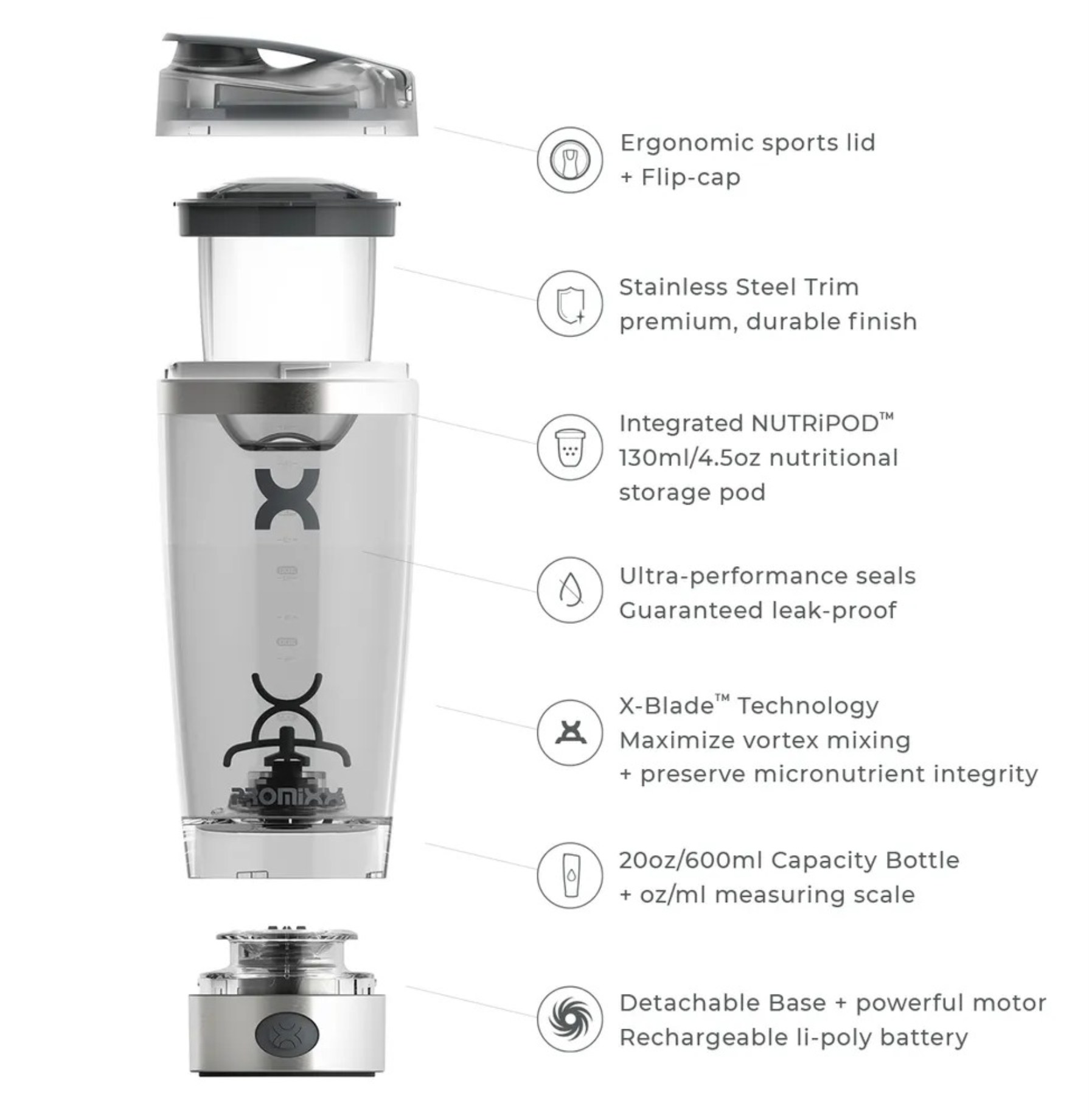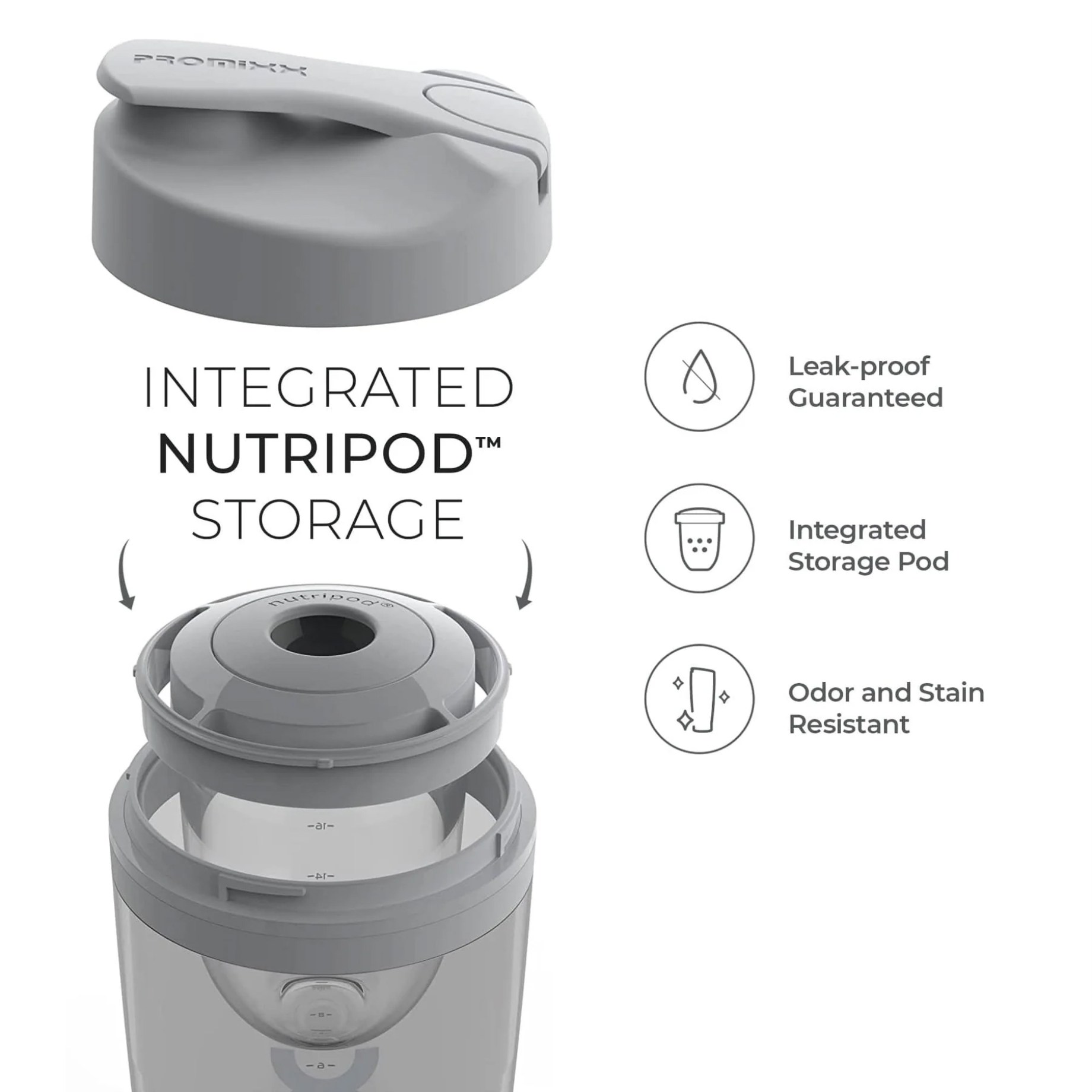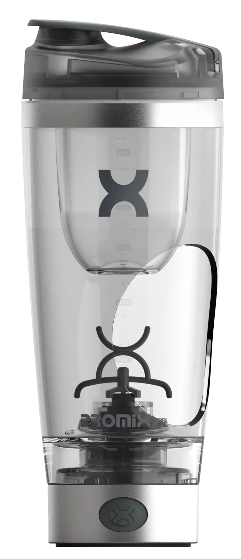 Promixx Pro Electric Shaker er en kraftfuld elektrisk shaker, der blander dine shakes jævnt og uden klumper – med blot et tryk på en knap. Takket være Vortex Mixing Technology får du en perfekt konsistens hver gang, uanset om du blander protein, PWO eller restitutionsdrik. Flasken er slidstærk, lækagesikker og lugtresistent. Den har et ergonomisk sportlåg og en integreret Nutripod, perfekt til opbevaring af dit pulver, indtil det er tid til at blande. Motoren oplades nemt med den medfølgende USB-C og giver op til 90 blandinger pr. opladning.