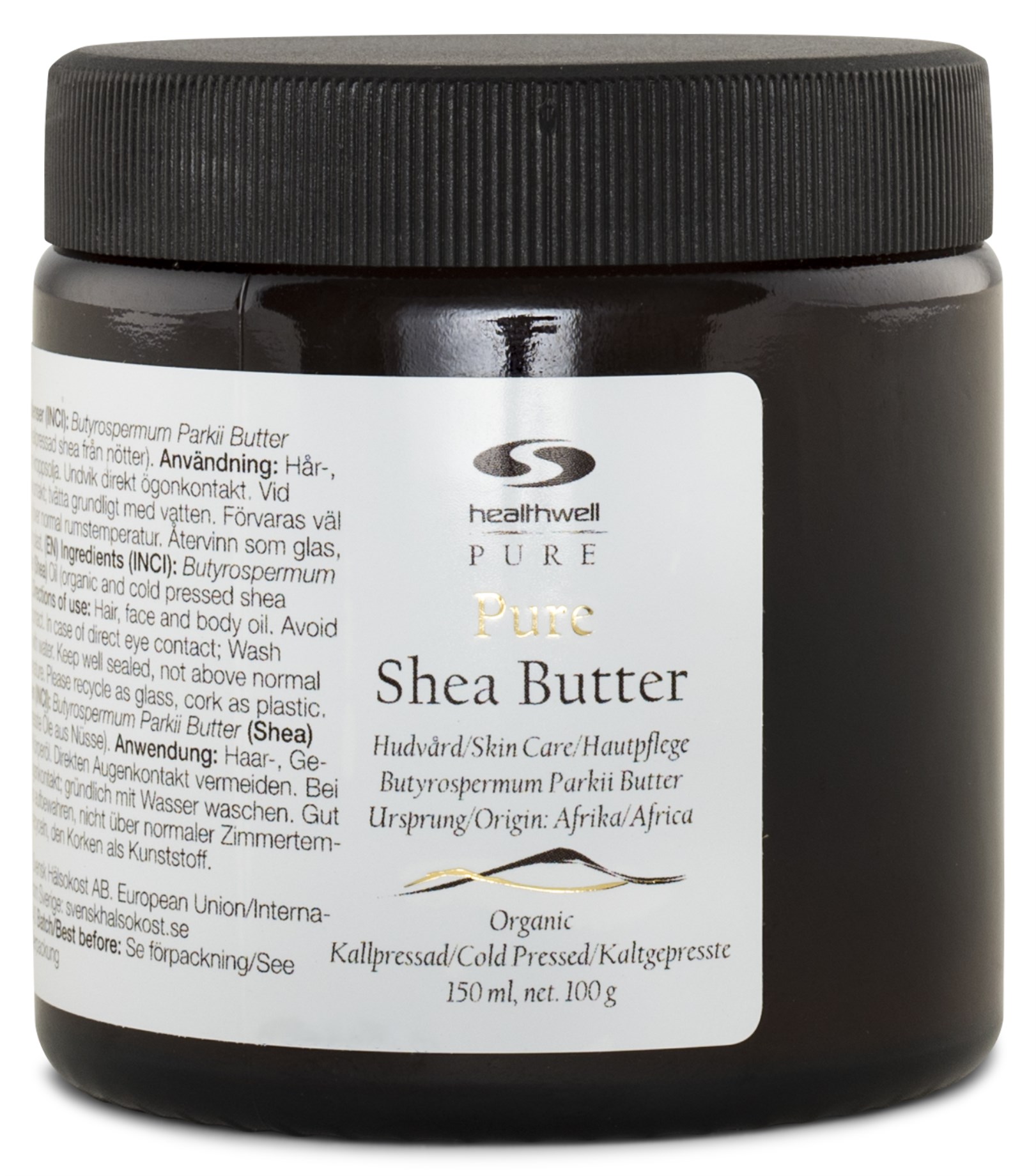 Healthwell PURE Sheasmør ØKO er et 100% naturligt sheasmør ( Butyrospermum Parkii Butter ) uden tilsætningsstoffer. Dette sheasmør er økologisk og koldpresset fra shea nødder fra Afrika. Shea er fremragende til tør hud i ansigt og krop samt som hårolie.