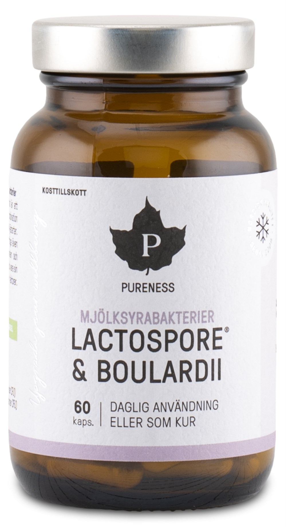 Pureness Mælkesyrebakterier + Boulardii indeholder en nøje udvalgt kombination af mælkesyrebakterier for en god fordøjelse og tarmflora. Den indeholder en sporedannende mælkesyrebakterie kaldet LactoSpore®. Sporeformen gør den både stærkere end de fleste mælkesyrebakteriestammer og modstandsdygtig over for mavesyre. Gæren Lynside® boulardii er en probiotisk gær. Både LactoSpore® og Lynside® boulardii er designet til at klare mavesyre og enzymer på den bedst mulige måde. Pureness Mælkesyrebakterier + Boulardii er bedst at tage, når maven er i ubalance, under antibiotikabehandling eller før en udlandsrejse.