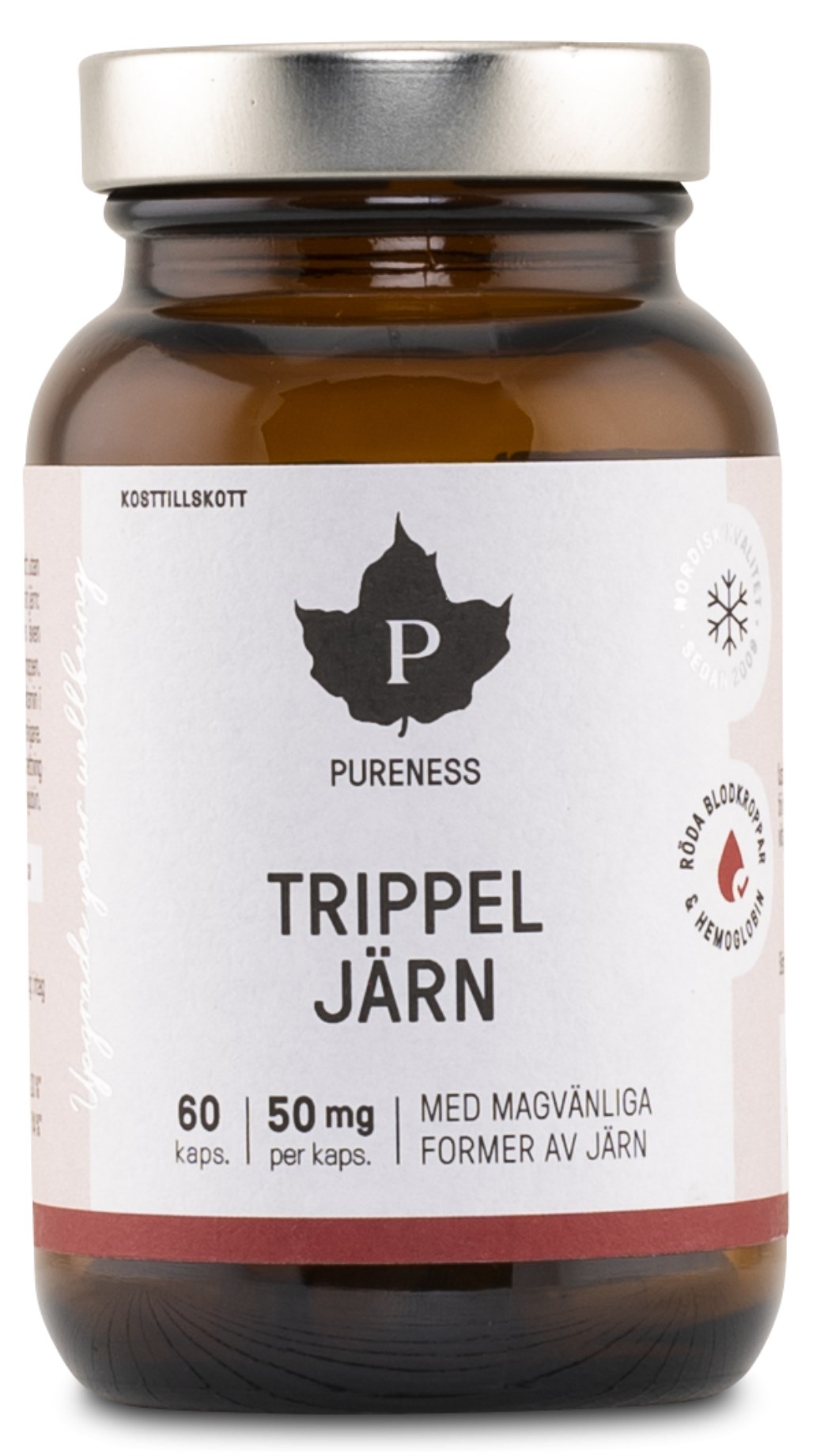 Pureness Trippel Jern er et stærkt jernkosttilskud baseret på to høj kvalitetsformer af jern: jernbisglycinat og jernfumarat. Den tredje komponent i Trippel Jern er laktoferrin, som er et glykoprotein, der naturligt forekommer i kroppen og indeholder meget jern, men som også deltager i transporten af jern i kroppen. Tilskuddet indeholder også C-vitamin for at optimere optagelsen yderligere i kroppen. Jern bidrager til normal energiomsætning og immunforsvar, reduceret træthed og er også vigtigt for dannelsen af røde blodlegemer.