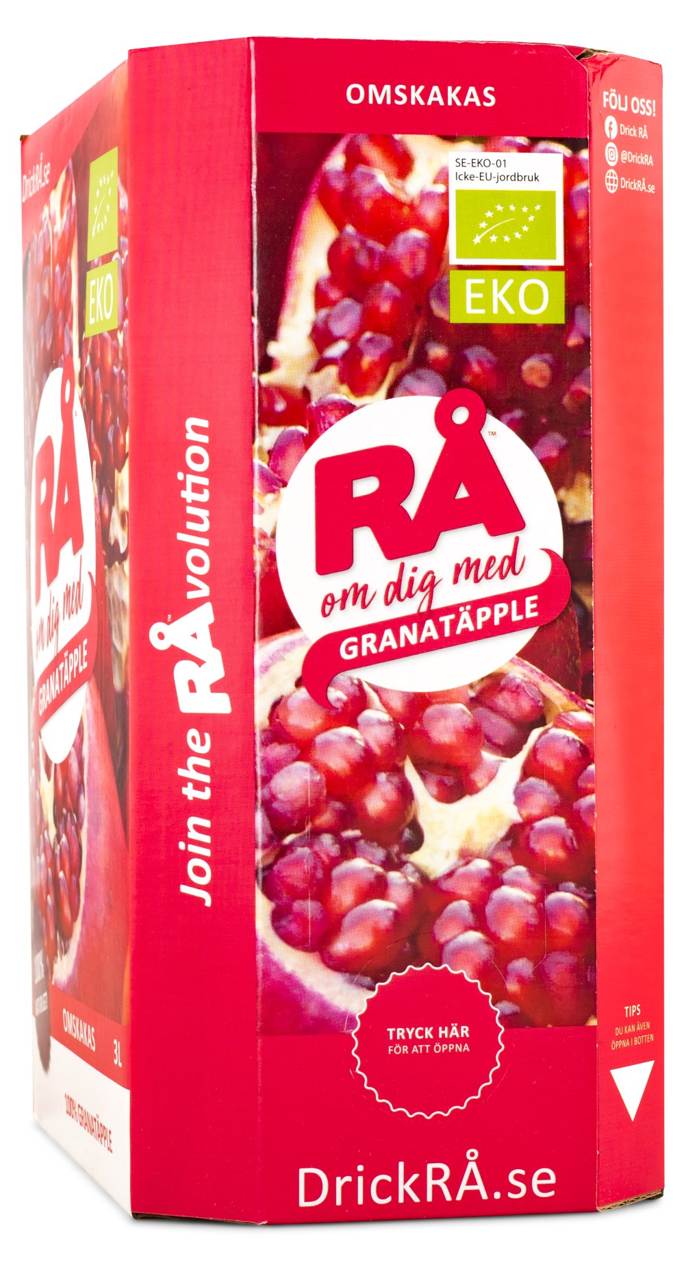 RÅ Granatæble ØKO fra WellNOx er en 100 % ren granatæblejuice, helt uden tilsætningsstoffer. Juicen fra økologiske granatæbler pasteuriseres og fyldes på bag-in-box. Det smarte ved bag-in-box er, at den ikke slipper luft ind, hvilket betyder, at juicen holder i mindst en måned efter åbning. Boksen indeholder 3 liter, hvilket svarer til en måneds forbrug.