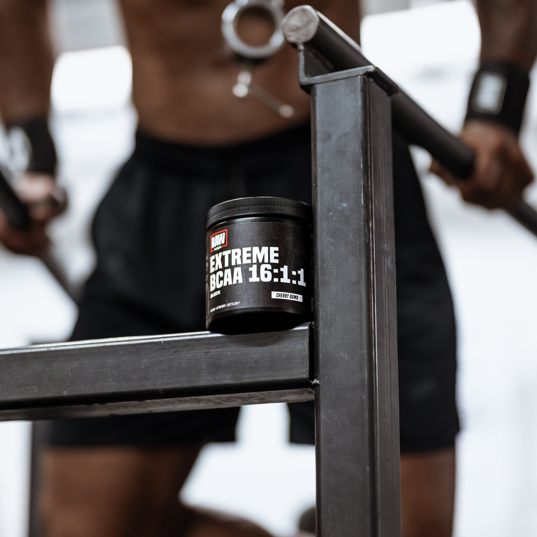 RAW SUPPS Extreme BCAA 16:1:1 i fokus, med en mand i baggrunden som udfører dips med kæder rundt om nakken.BCAA for optimale forudsætninger for muskelopbygning og restitution.