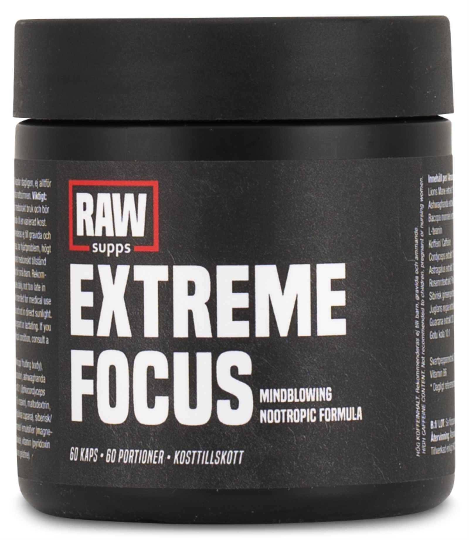 RAW Extreme Focus har kombineret nogle af vores tids mest omtalte stoffer for årvågenhed og fokus: en blanding af ti ekstrakter fra svampe og urter sammen med koffein, L-theanin, B6 og piperin. Udviklet til dig der vil overvinde enhver tænkelig modstand i træningscenteret eller i livet selv.