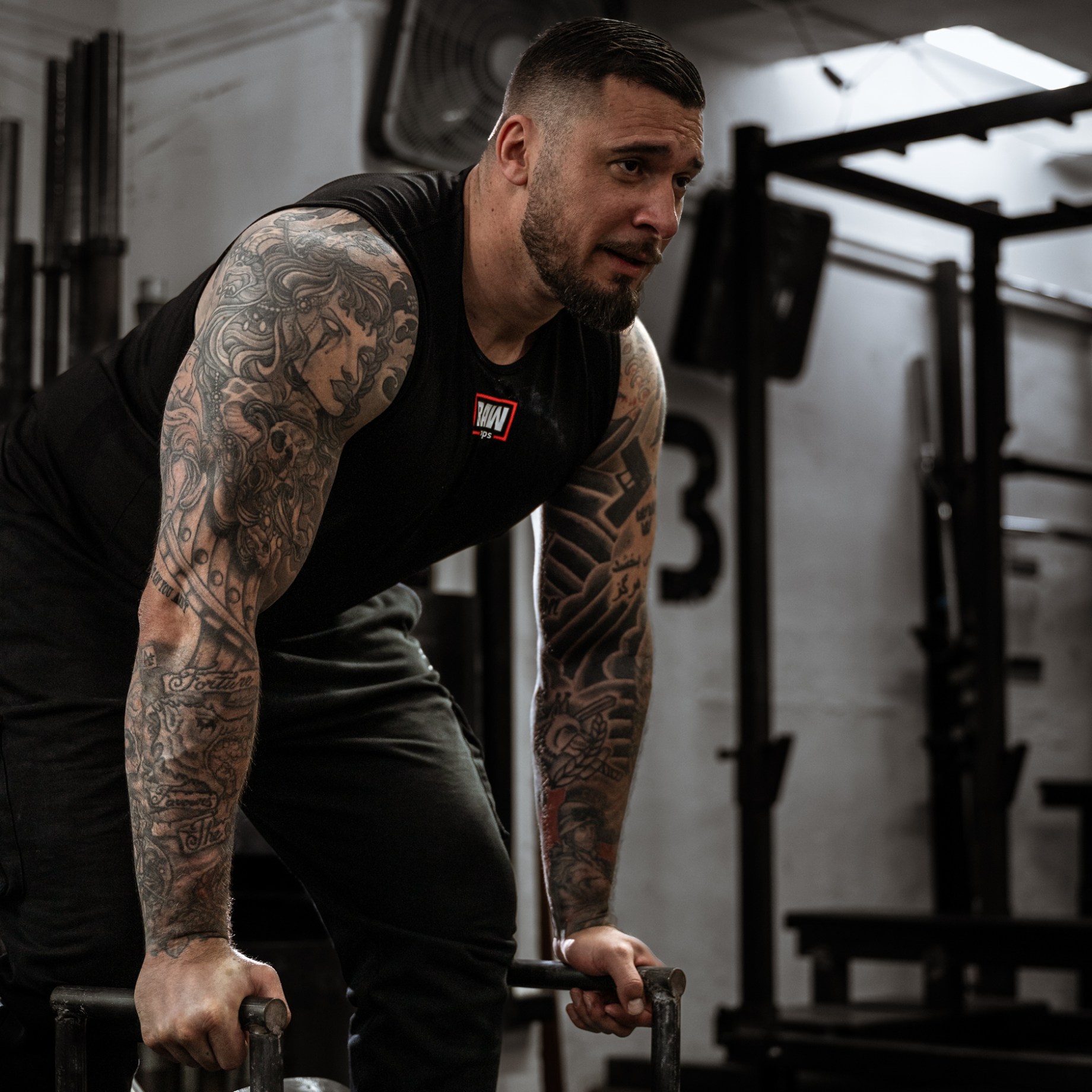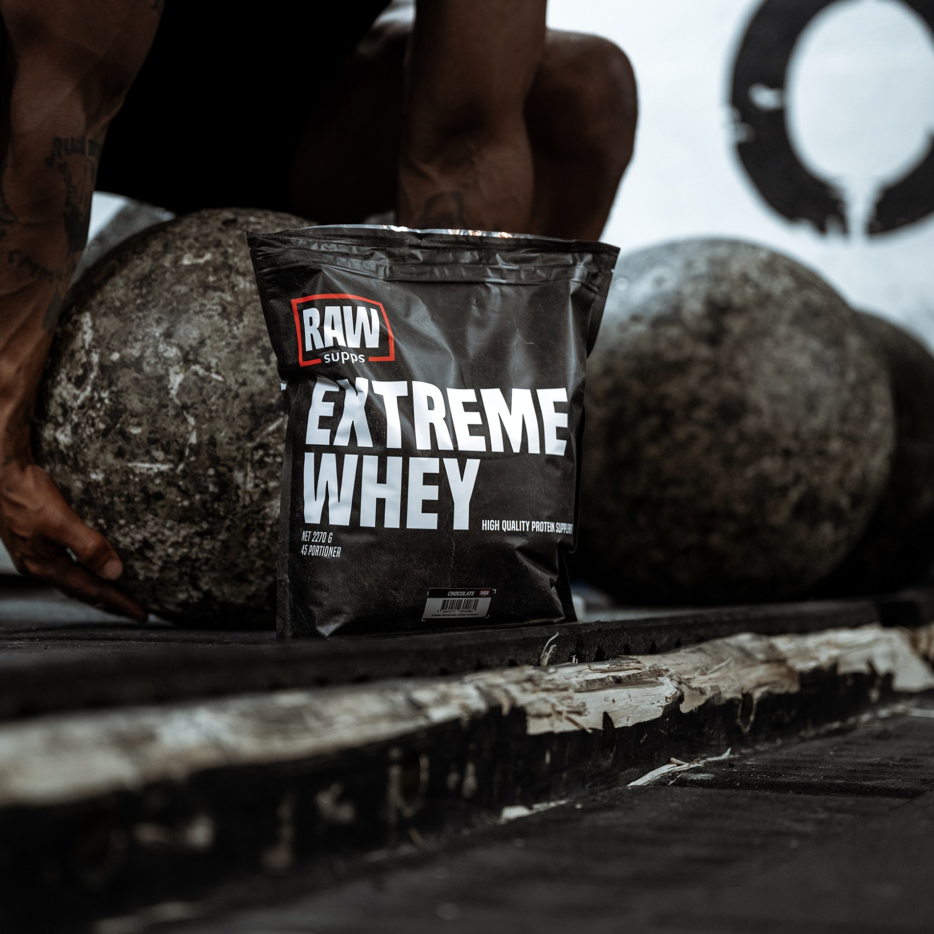 RAW Extreme Whey i fokus, placeret foran en person som løfter atlas-sten i et træningscenter.RAW Extreme Whey – højkvalitets protein til dig som vil makimere dit indtag og resultat.