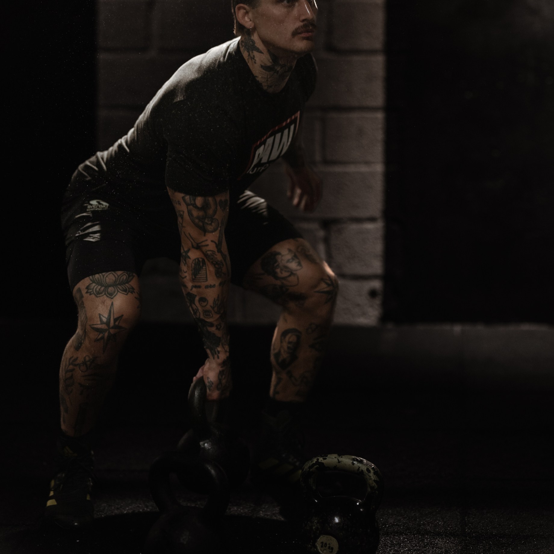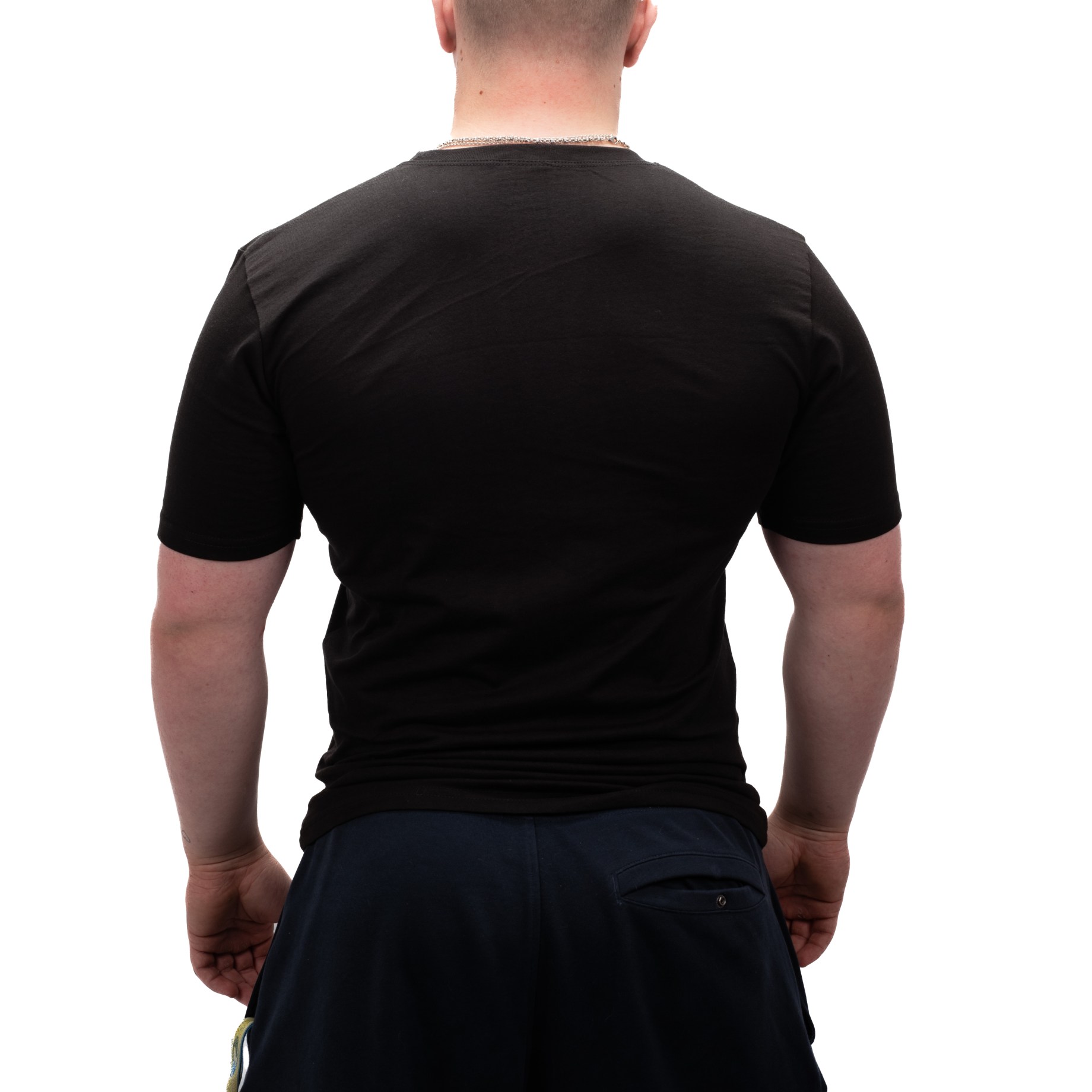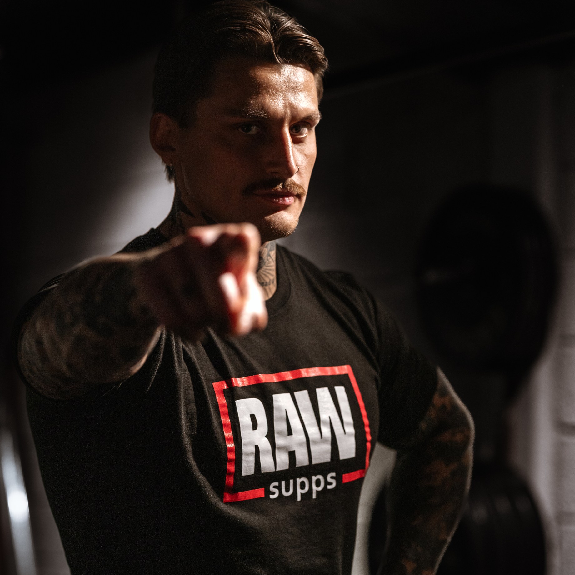 En person som har en RAW SUPPS Logo Tee på i et træningscenter.En t-shirt som passer både til hård træning og en afslappende hverdag.