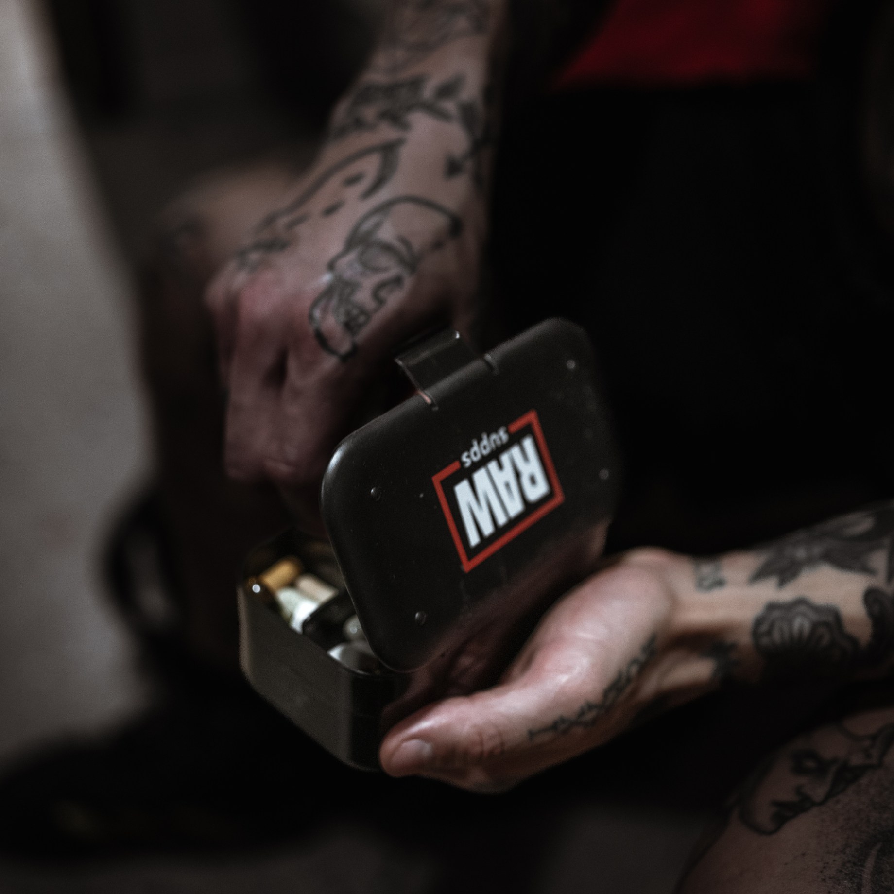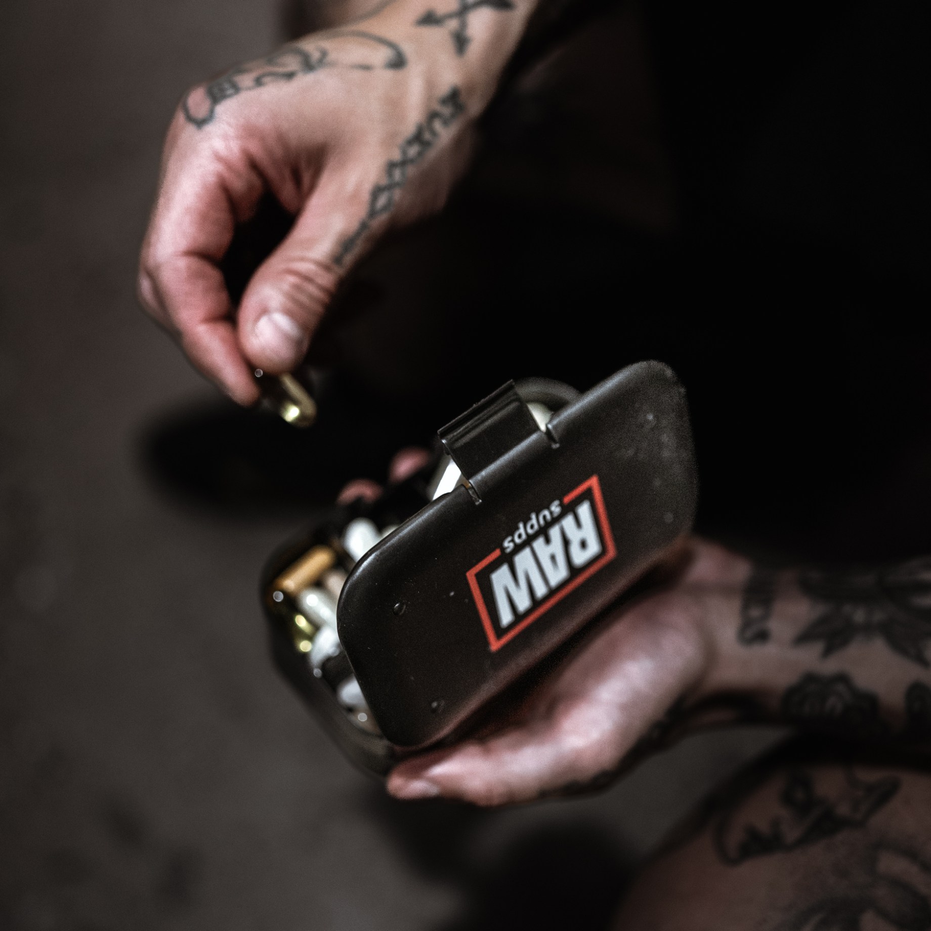 En person holder RAW SUPPS Pill Box fyldt med kapsler.Planlæg og opbevar dine kosttilskud enkelt i RAW SUPPS Pill Box!