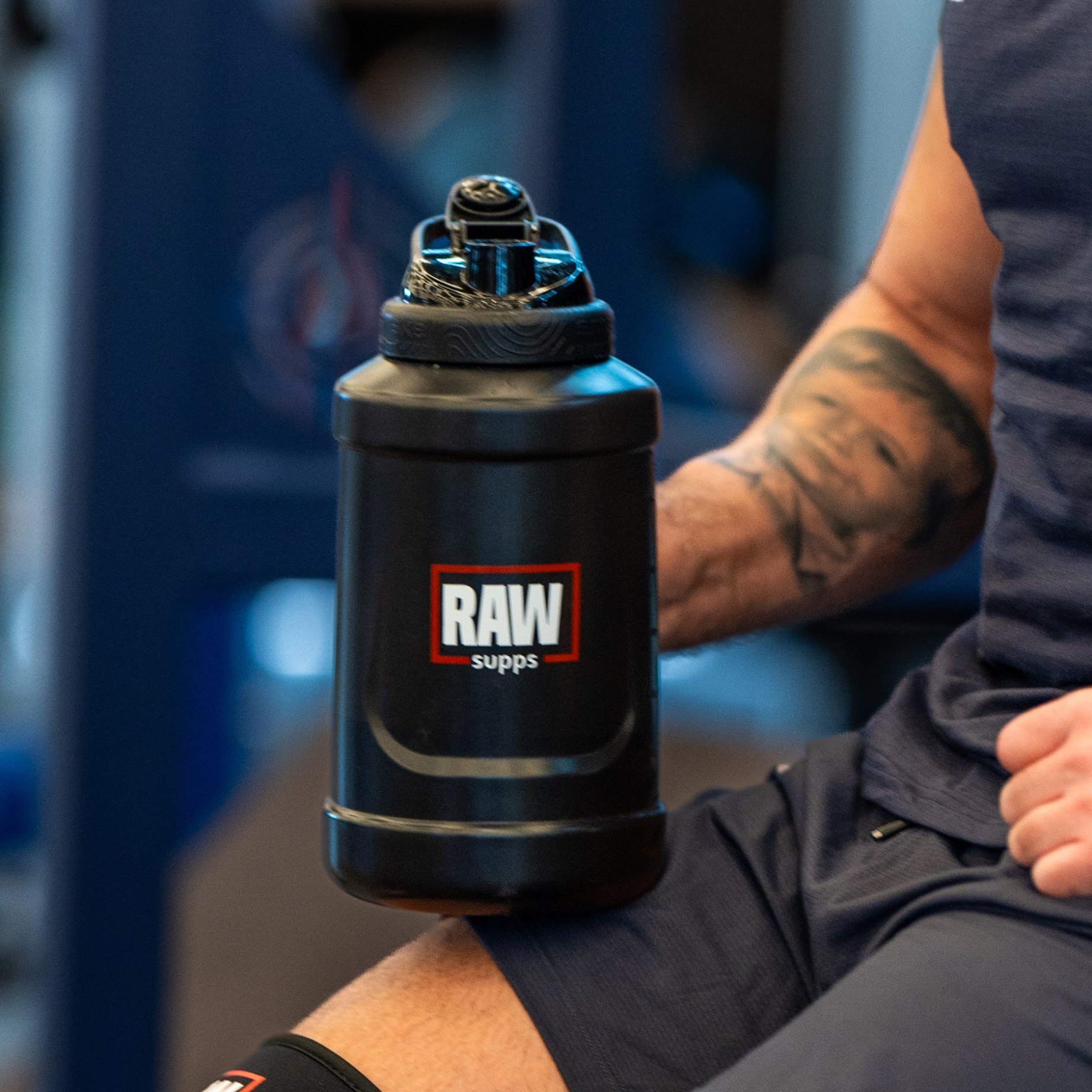En person i træningstøj med en RAW Ultimate Jug hvilende på knæet.Med den store RAW Ultimate Jug slipper du for at gå frem og tilbage for at genopfylde din vandflaske.