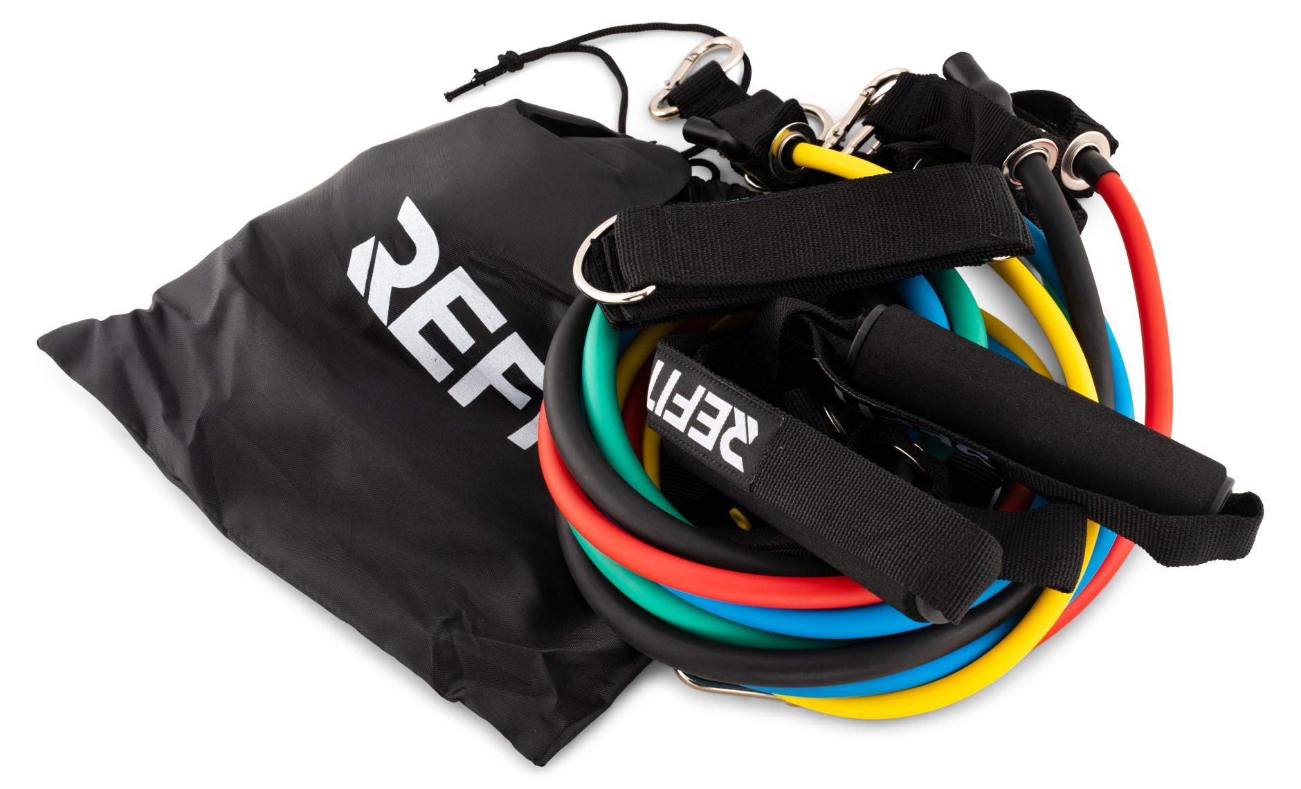 Refit Basic Tube Multiset er et træningsredskab til hele kroppen. Du kan effektivt træne dine ben, bryst, ryg, skuldre og arme. Basic Tube Multiset indeholder 5 exertubes med karabinhage i 5 forskellige modstande samt 2 håndtag, 2 ankelbeslag og et dørbeslag, som du kan bruge i flere forskellige variationer. Let at opbevare og let at tage med i den medfølgende taske. Træn hele din krop uden at skulle forlade hjemmet!