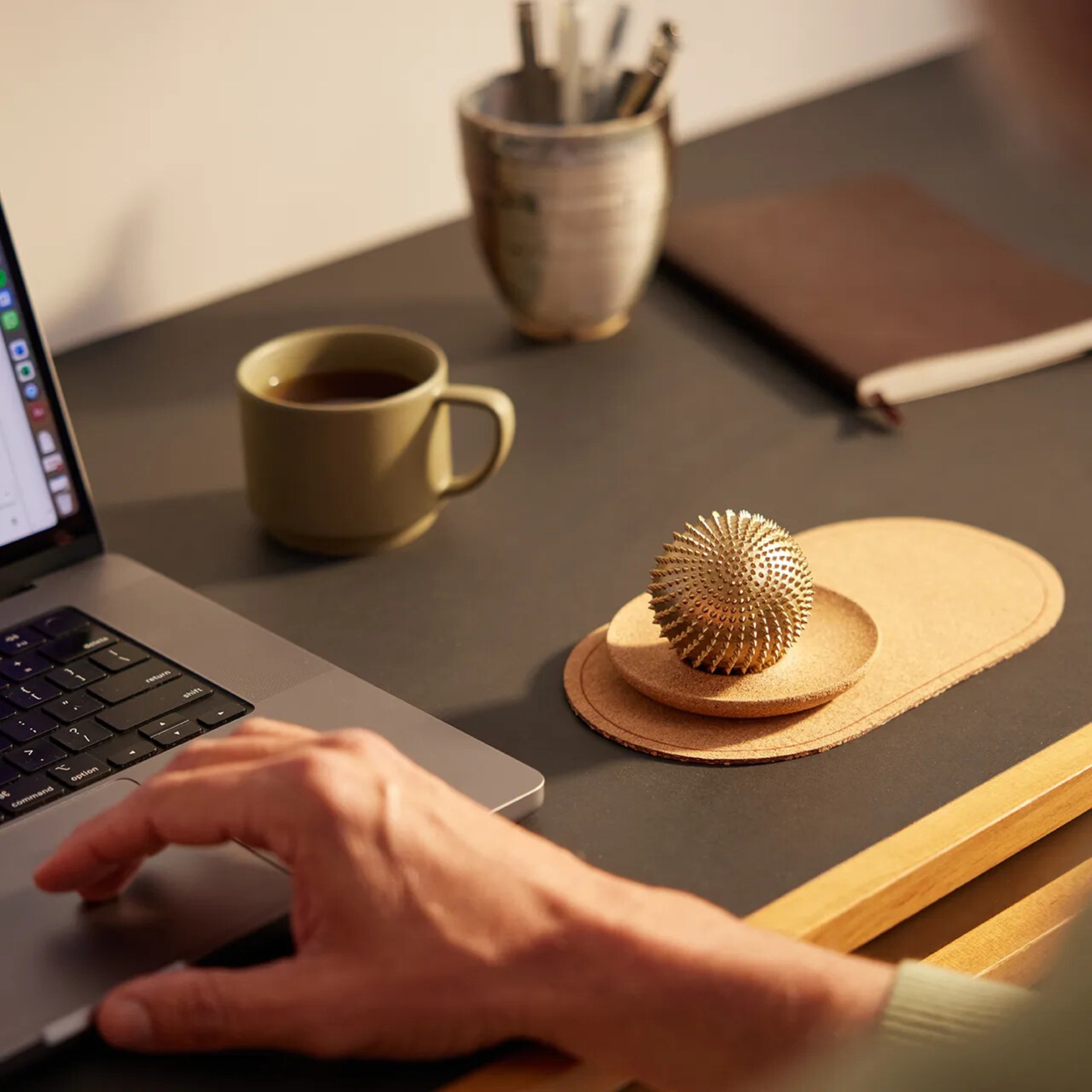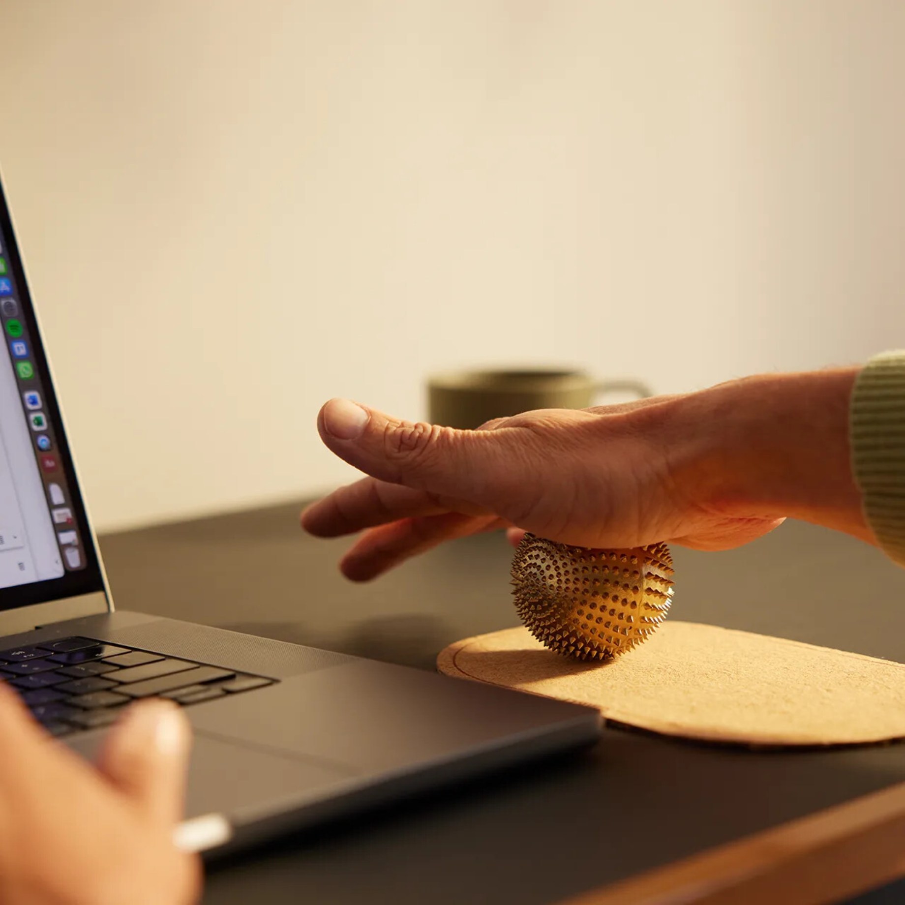 Shakti Wonderball er en praktisk akupressurbold til hele kroppen. Bolden er lavet af hudvenlig messing og har hele 658 spidse pigge, der tager hånd om ømme og spændte muskler. Trods dette vejer den kun 200 gram og har en diameter på 6,5 cm og er derfor perfekt til målrettede behandlinger og triggerpunktsmassage. Rul bolden nemt i hånden over spændte områder og mærk forskellen. Opbevar bolden nemt på de naturlige korkplader, der følger med.