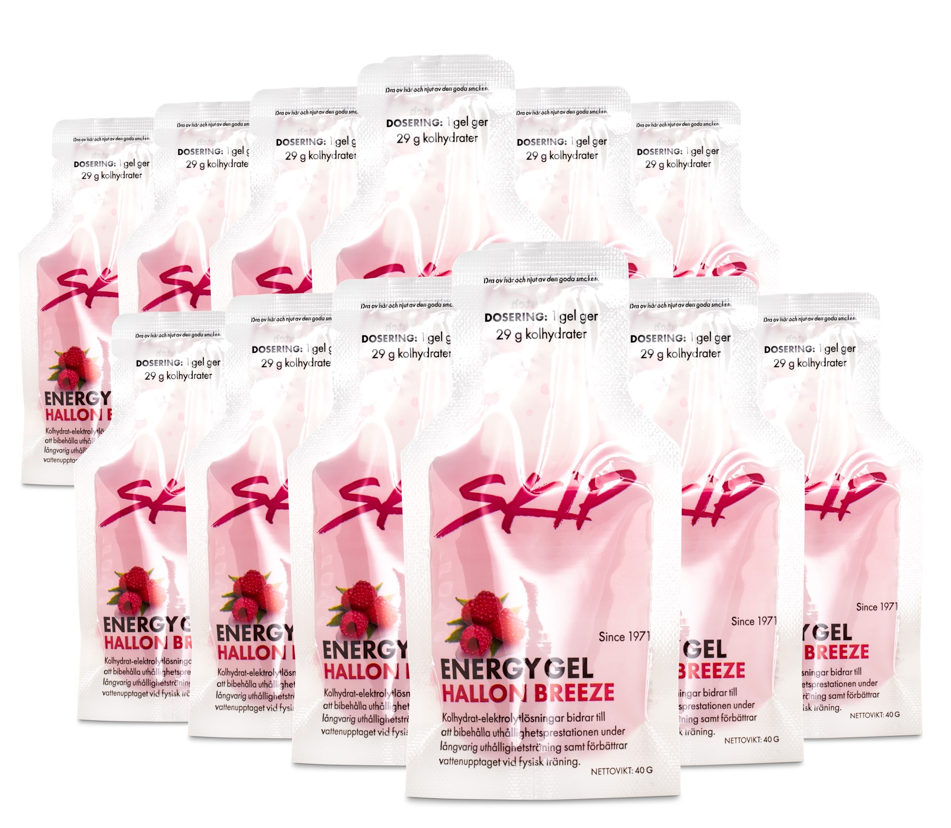 Energi Gel från Skip innehåller Skip®CarboMatrix som är en blandning av glukossirap, maltodextrin och fruktossirap. Dessa tre kolhydratskällor har lite olika inverkan på kroppen och ser till att du får energi ut portionerat över tid. Glukos och maltodextrin tas snabbt upp av kroppen och förser dig med energi på en gång, medan fruktos har lite längre upptagningsförmåga i kroppen och pytsar ut energi till dig och musklerna över tid. Skip Energy Gel innehåller även elektrolyter, mineraler och salter. Dessa ämnen förbrukas när vi svettas, något som vi har en tendens att göra i stora mängder när vi tränar eller utför ett långdistanslopp. Genom att energigelen innehåller mineraler och salter undviker vi även att drabbas av kramper.