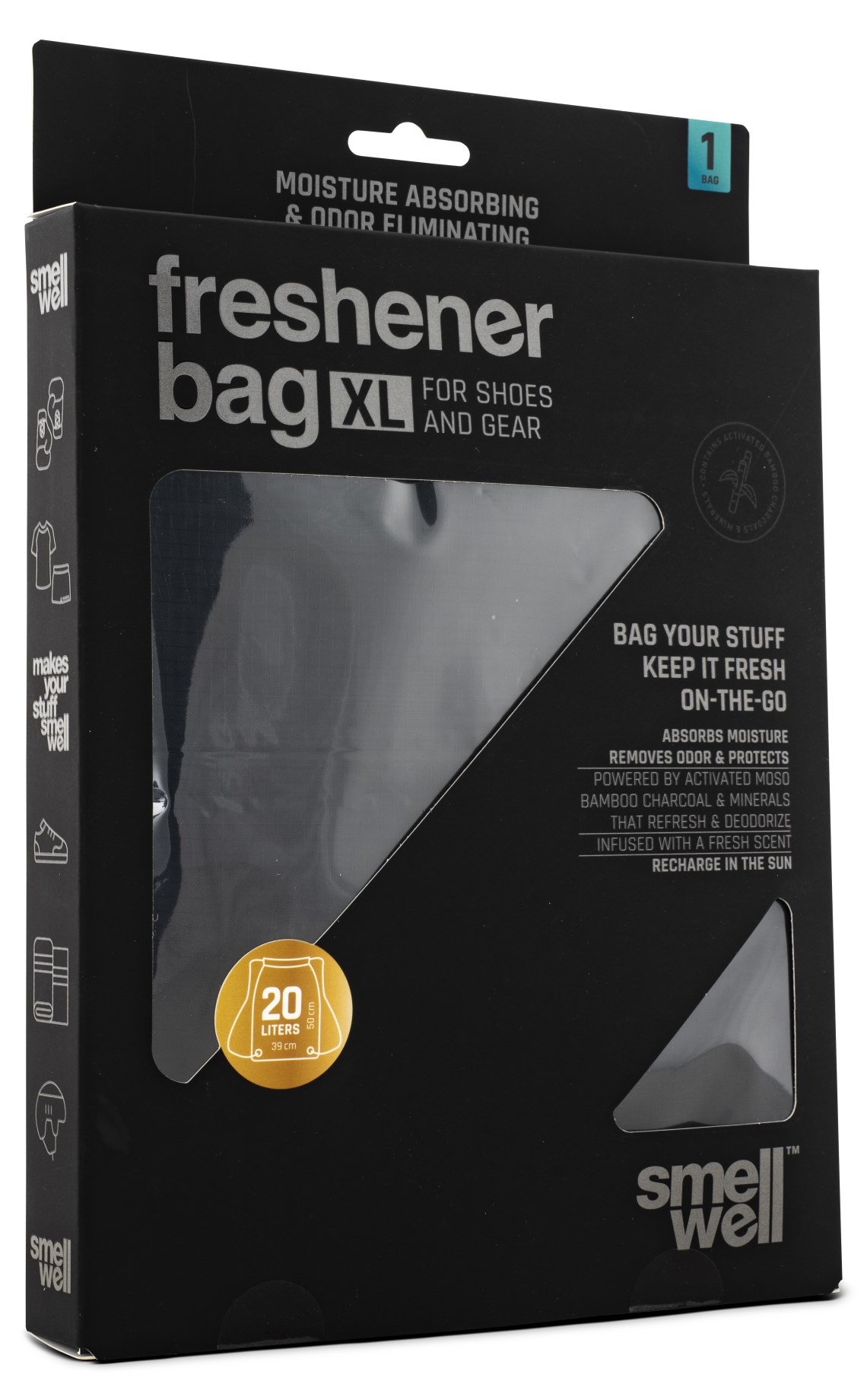 SmellWell Freshener Bag XL er en funktionel taske, der holder dine sko og tøj friske. Posen absorberer fugt, fjerner dårlig lugt og modvirker fremkomsten af bakterier. Den har en mild parfume, der efterlader en frisk duft. Duften kan aftage med tiden. For at genvinde effekten kan du vende posen ind og ud og placere den i solen et par gange om året. Du kan bruge tasken som en træningstaske eller til at adskille dine brugte sko, træningstøj eller håndklæde fra resten af dine ting i træningstasken. Tasken rummer 20 liter.