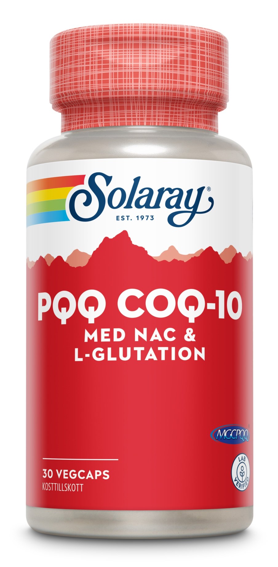 Solaray PQQ CoQ-10 kombinerer fire kraftfulde stoffer - PQQ, Q10, NAC og glutathion - for at støtte energi og cellehelbred. I stedet for at købe dem separat får du alle fire stoffer i en praktisk kapsel, der tages én gang om dagen.