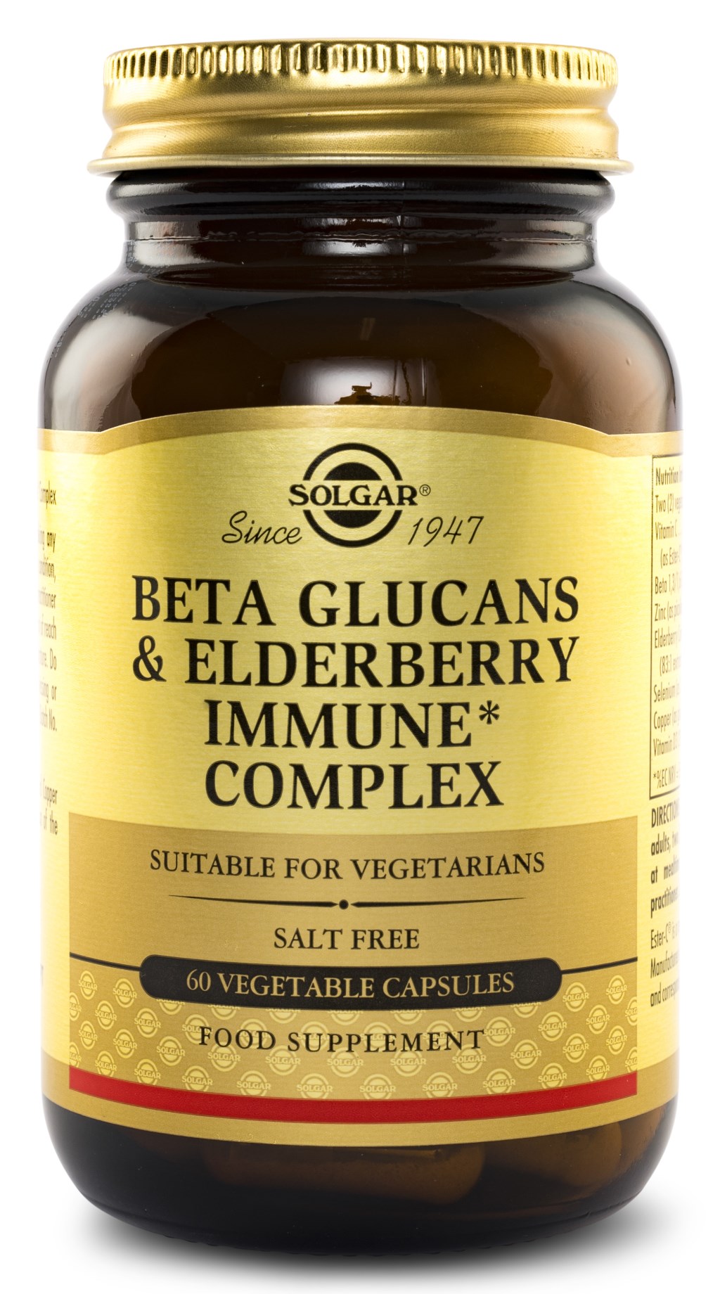Solgar® Beta-glucan & Hyldebær (Solgar® Beta glucan & Elderberry Immune Complex) er et dagligt tilskud til dig, der ønsker at sikre dit indtag af disse næringsstoffer. Produktet indeholder kun vegetabilske ingredienser med beta-glucaner, hyldebær-ekstrakt samt en kombination af vitaminer og mineraler.