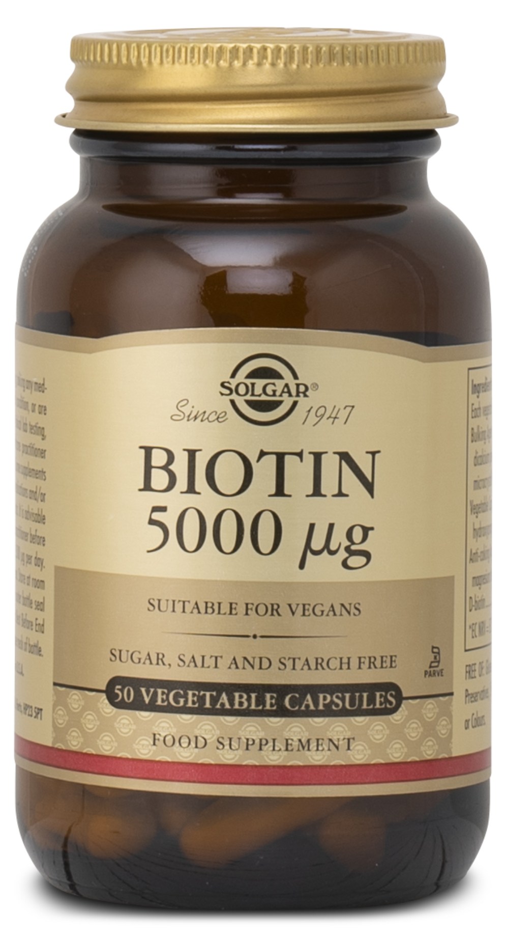 Solgar Biotin 5000 ug er et højdosis kosttilskud med B7-vitamin. En kapsel om dagen giver dig 5000 mikrogram vegetabilsk biotin. Biotin er et vandopløseligt vitamin, der hjælper hud- og hårenzymer med at fungere optimalt, hvilket hjælper med at opretholde sundt hår og normal hud. Vitaminet letter også kroppens energiomsætning. Kapslerne fra Solgar er vegetabilske og fri for gluten og gær.