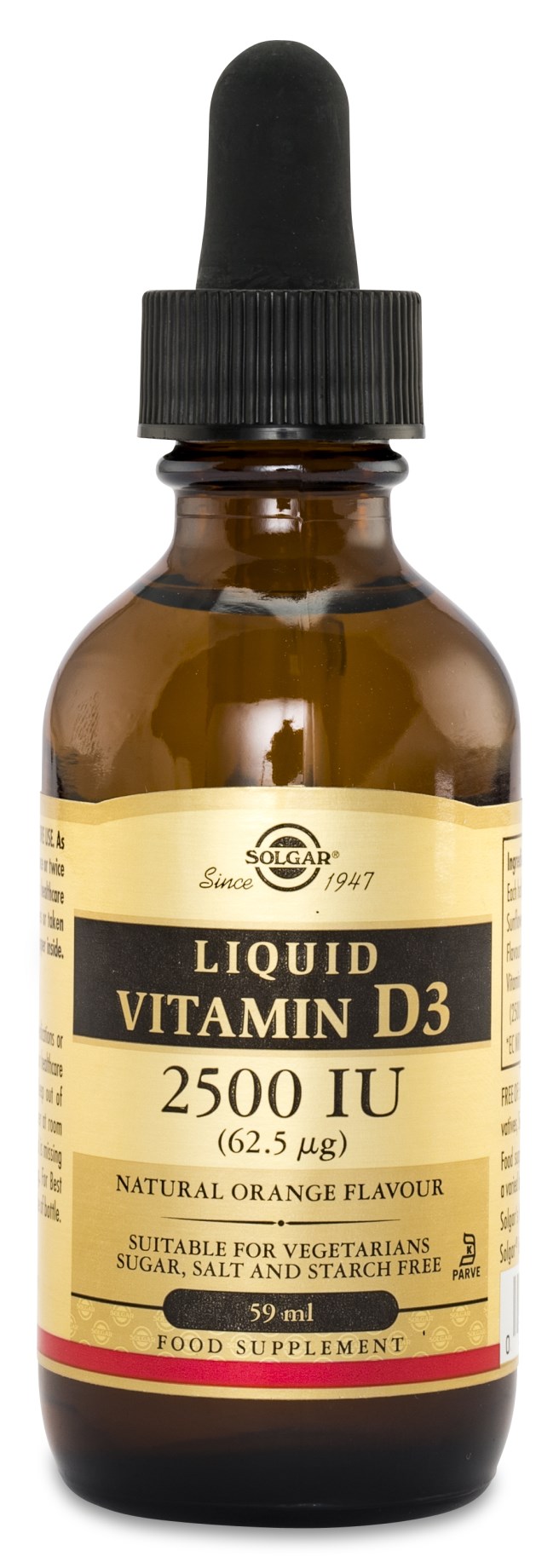 Hvem bliver ikke frisk og glad af at opholde sig i solen? Solgar® Vitamin D3 Liquid 2500 IE er flydende solskin på flaske. Det er fra solen, vi får vores boost af D-vitamin, og her i Norden har vi svært ved at få nok i vintermånederne. D-vitamin er nødvendig for mange funktioner i kroppen, herunder for at immunforsvaret fungerer normalt og for at opretholde en normal knoglestruktur. Denne flydende D-vitamin fra Solgar® har appelsinsmag og tilsat solsikkeolie for bedste optagelse. Kun et par dråber er nødvendige for at dække dagsbehovet, og en flaske rækker i næsten 4 måneder.