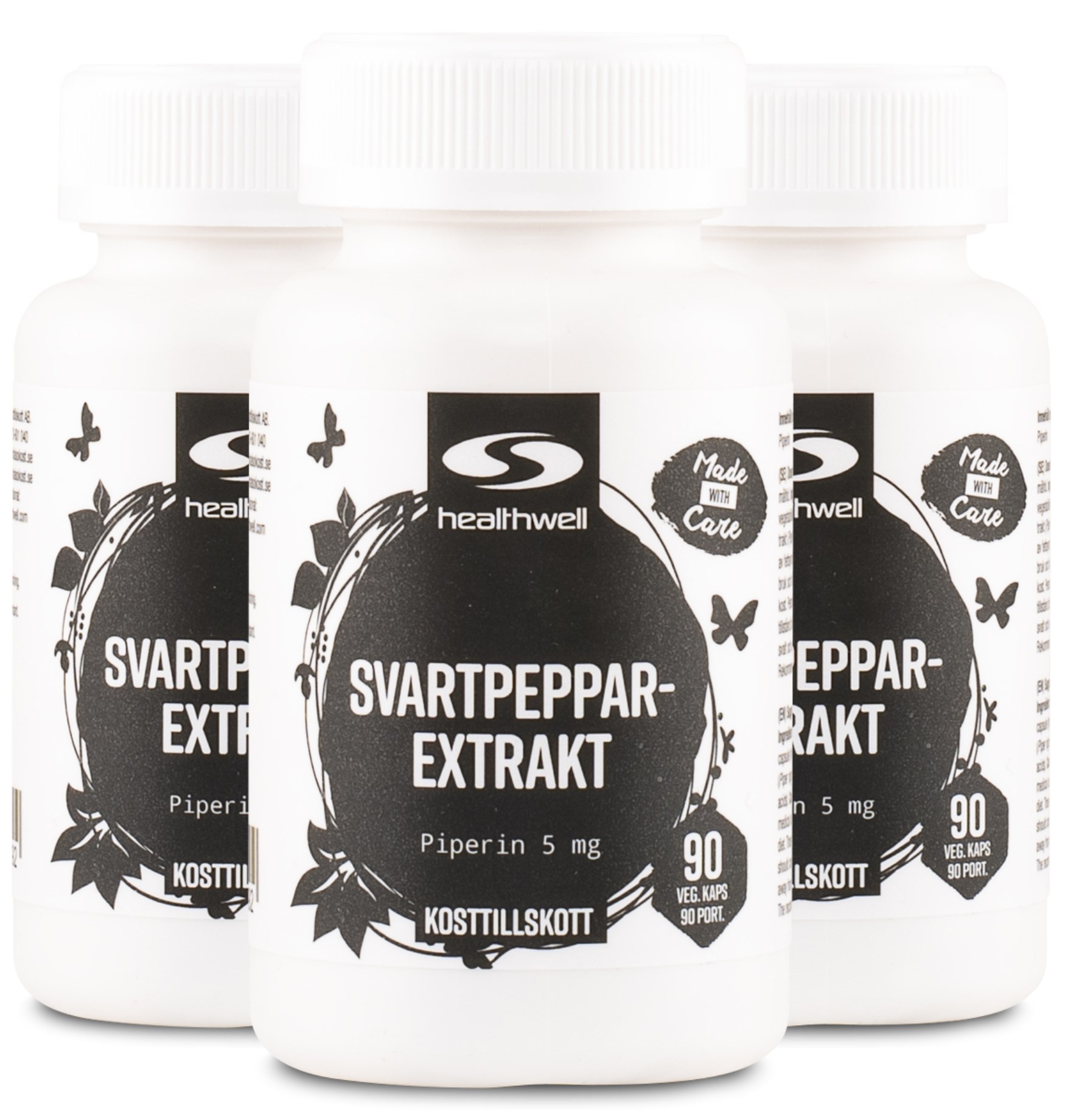 Sort peberekstrakt er et grøntsagstilskud med sort peberekstrakt (Piper nigrum), med et højt indhold af piperin. Piperin anses for at være den aktive ingrediens i sort peber, som hjælper med at fremme optagelsen af visse næringsstoffer. En kapsel Sort peberekstrakt Piperine indeholder 5 mg piperin og anbefales at tage før måltider for den bedste effekt.
