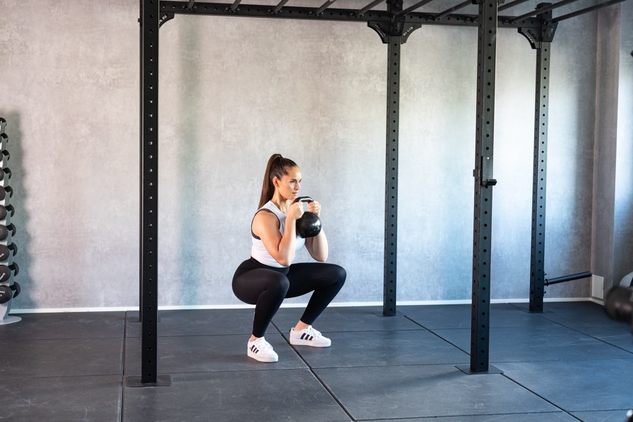 Goblet squat er en variant af squat, hvor du holder en vægt foran dig i brysthøjde og tæt på kroppen. Vægten kan være i form af en kettlebell, håndvægt eller vægtskive. En fantastisk øvelse for balder, for- og bagside af lårene samt kernen, men også til at forbedre mobiliteten i hofter, lår, lyske og ankler.