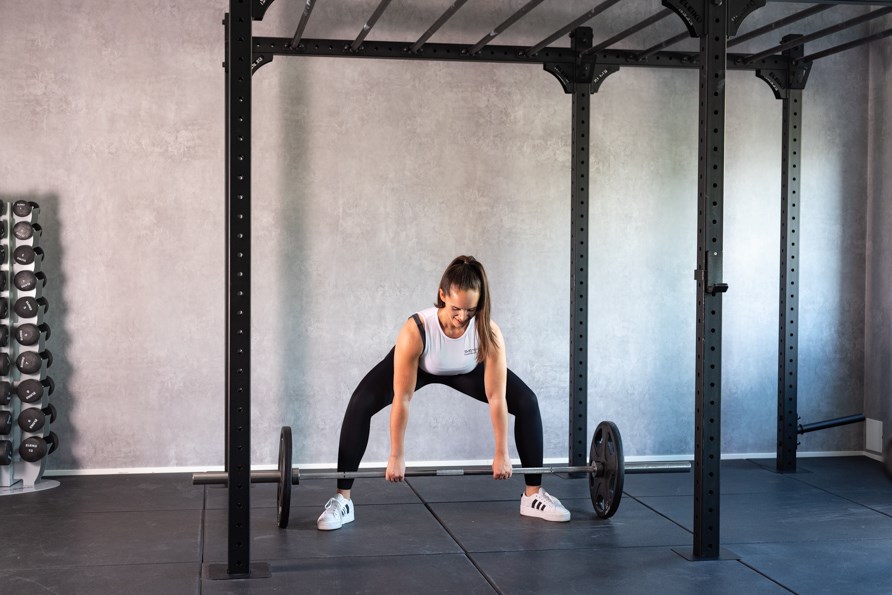 • Hvor bredt du vælger at stå, er meget individuelt, nogle har fødderne næsten ved vægtskiverne, mens andre kun vælger noget bredere end ved almindelige dødløft.