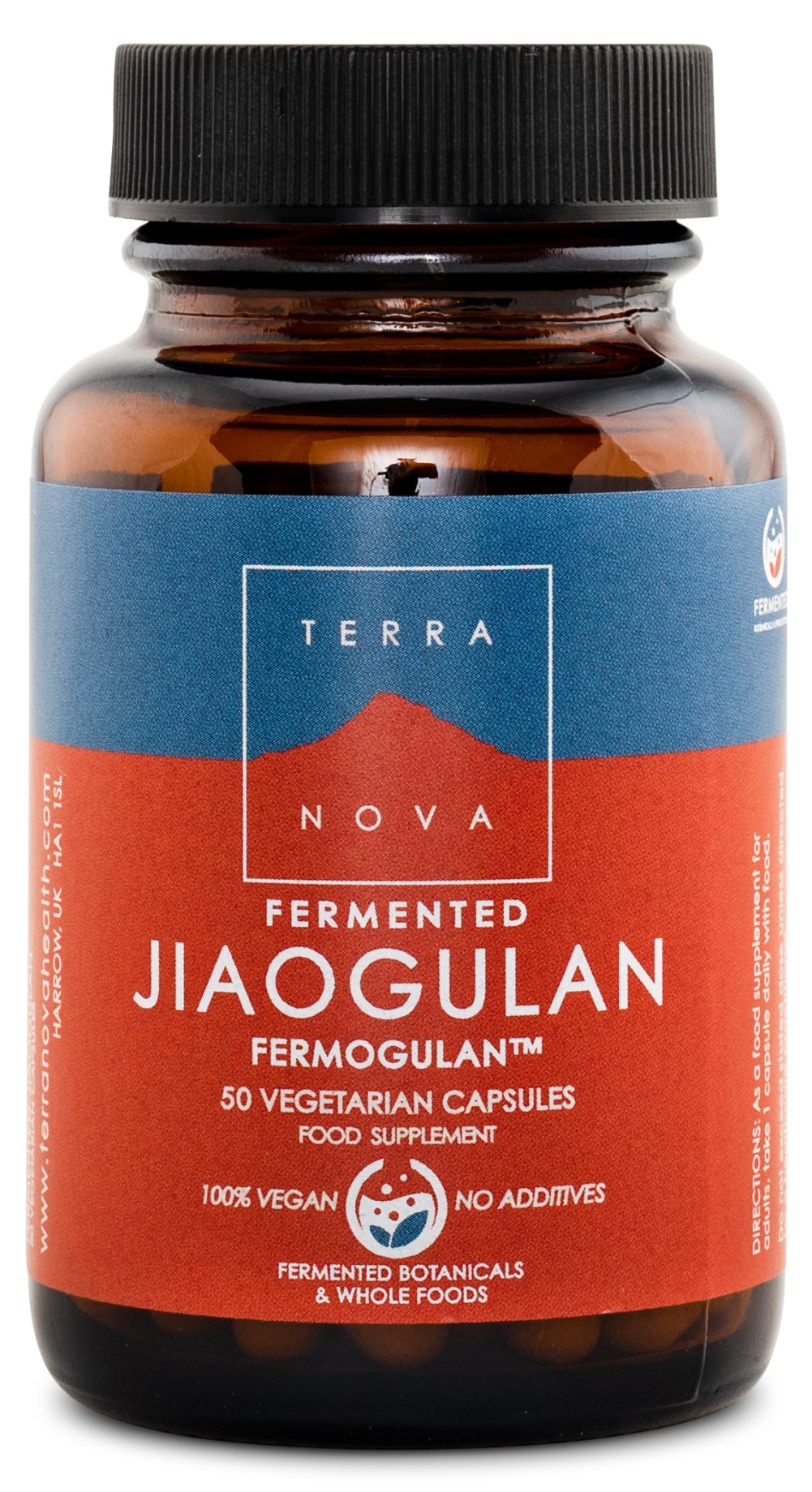 Terranova Fermented Jiaogulan Fermogulan er et kosttilskud med fermenteret jiaogulan (Gynostemma pentaphyllum), en flerårig vinstok, der vokser i Syd- og Sydøstasien. Det er en adaptogen urt, der er tæt beslægtet med ginseng. Den har længe været brugt i Kina, hvor den kaldes "evighedens urt" eller "udødelighedens urt". Jiaogulan er rig på polysaccharider, vitaminer, aminosyrer, flavonoider og saponiner. Ved at fermentere urten øges mængden af aktive stoffer og det bliver også nemmere for kroppen at optage disse. Terranova Fermenteret Jiaogulan Fermogulan kan med fordel bruges i perioder, hvor du har brug for energi og skarphed. Tilskuddet er 100% naturligt og indeholder ingen rester af pesticider, konserveringsmidler eller tungmetaller.