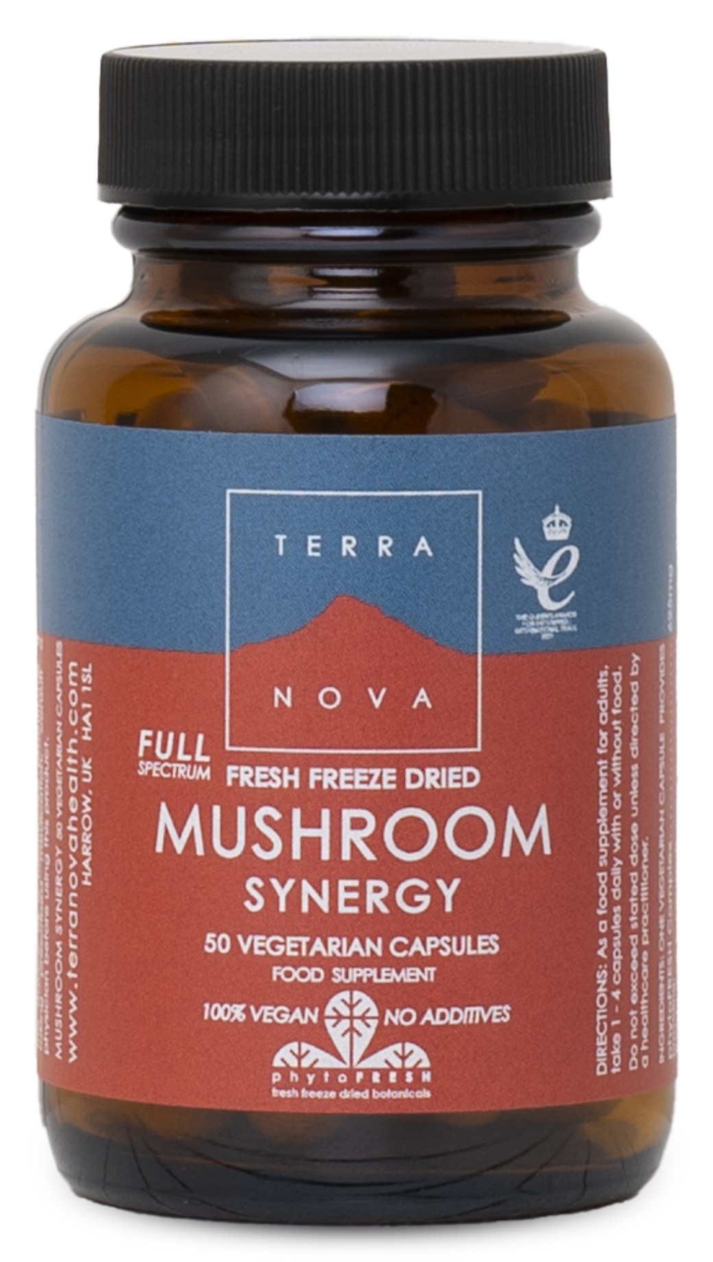 Full Spectrum Mushroom Synergy fra Terranova er et kosttilskud, der indeholder en kombination af meget aktive og ubehandlede planter og superfoods. Det indeholder også en rig blanding af adaptogener, såsom cordyceps, chaga og shiitake. Adaptogener er naturlige urter, der siges at hjælpe med at opretholde en sund tilstand og fremme kroppens immunsystem. Terranovas ernæringstilskud er naturlige og 100% veganske og indeholder urter og planter, der er økologisk dyrket.