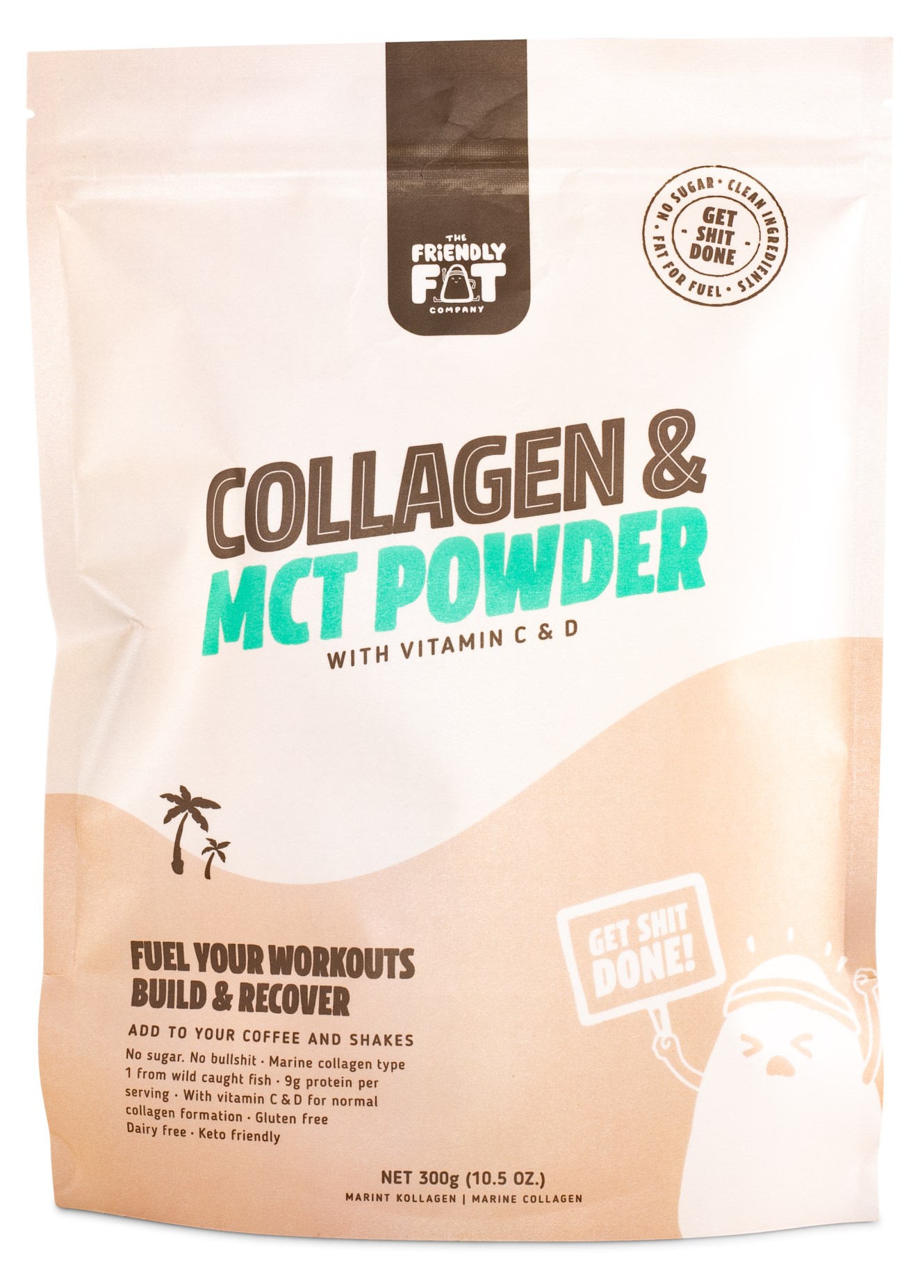 The Friendly Fat Company MCT Collagen er et marine kollagenpulver med vitamin C og D, acaciefibre og C8 MCT-olie. 100% C8 MCT olie (caprylsyre) fra kokosnød og kollagen fra vildtfanget nordatlantisk fisk. Du kan let blande pulveret i kaffe, shakes eller smoothies inden træning, opbygning af muskler efter træning eller som en restitution.