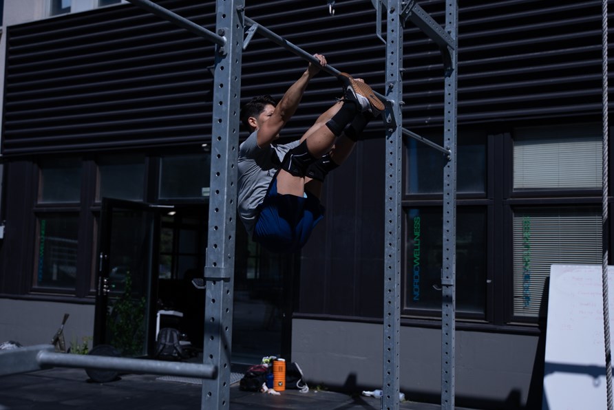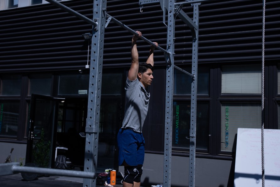 1. Begynd med at hænge i stangen med hænderne lidt bredere end skulderbredde.