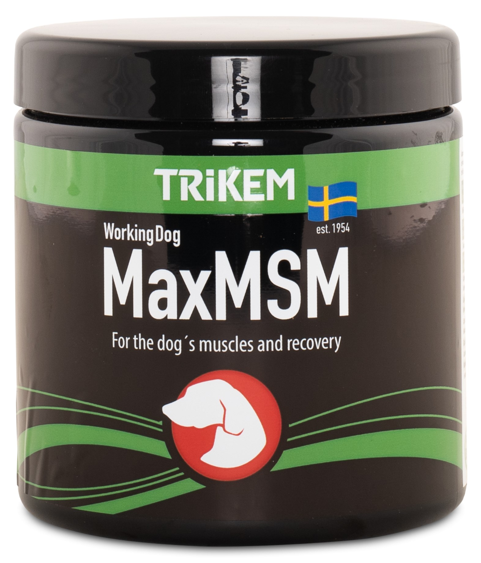 Trikem WorkingDog MaxMSM er et komplementært supplement med MSM til aktive og brugshunde inden for trækkraft, brug og jagt med mere. For at kunne præstere langsigtet har disse hunde brug for den rette balance af vitaminer, mineraler, næringsstoffer og sporstoffer. MSM, som er kroppens svovlkilde, er vigtig for kroppens celledannelse og indgår i strukturen af sener, brusk, bindevæv, skelet, muskler og pels. Hvis din hund lider af MSM-mangel, påvirkes dens ydeevne. Derudover tager musklerne længere tid om at restituere. Med en omhyggeligt udviklet formel, der både smager godt og indeholder præbiotisk gærkultur, som virker stabiliserende på tarmen og samtidig forbedrer næringsoptagelsen. Giv din hund de bedste forhold med Trikem WorkingDog MaxMSM!