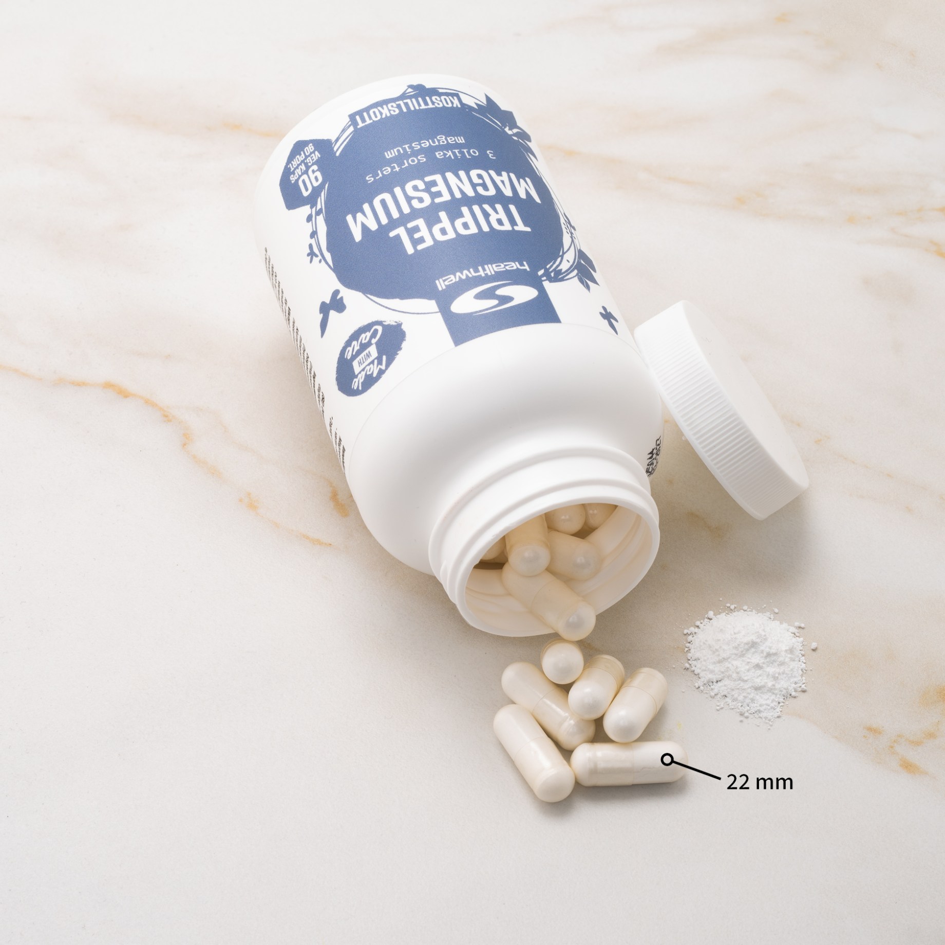 Healthwell Trippel Magnesium indeholder tre forskellige former for magnesium, hvilket øger kroppens evne til at absorbere mineralet samtidig med, at risikoen for mavegener ved højere indtag mindskes.