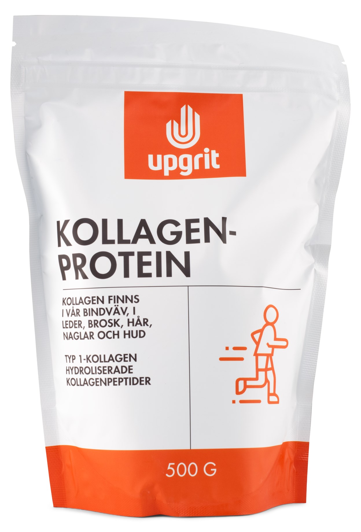 Upgrit Kollagenprotein er et rent kollagenprotein fra græsfodrede køer. Proteinet er rigt på glycin, prolin og hydroxyprolin, tre aminosyrer, som vores krop bruger til at lave sit eget kollagen. Kollagen findes i led og ledbrusk, hud, hår og negle, men vores krops egen produktion falder med alderen. Kollagenproteinet fra Upgrit er af højeste kvalitet og kommer fra græsfodrede køer. Proteinet har en neutral smag og er derfor perfekt til at blande i smoothies, kaffe, bagning eller supper. Den blandes let i både kolde og varme drikke.