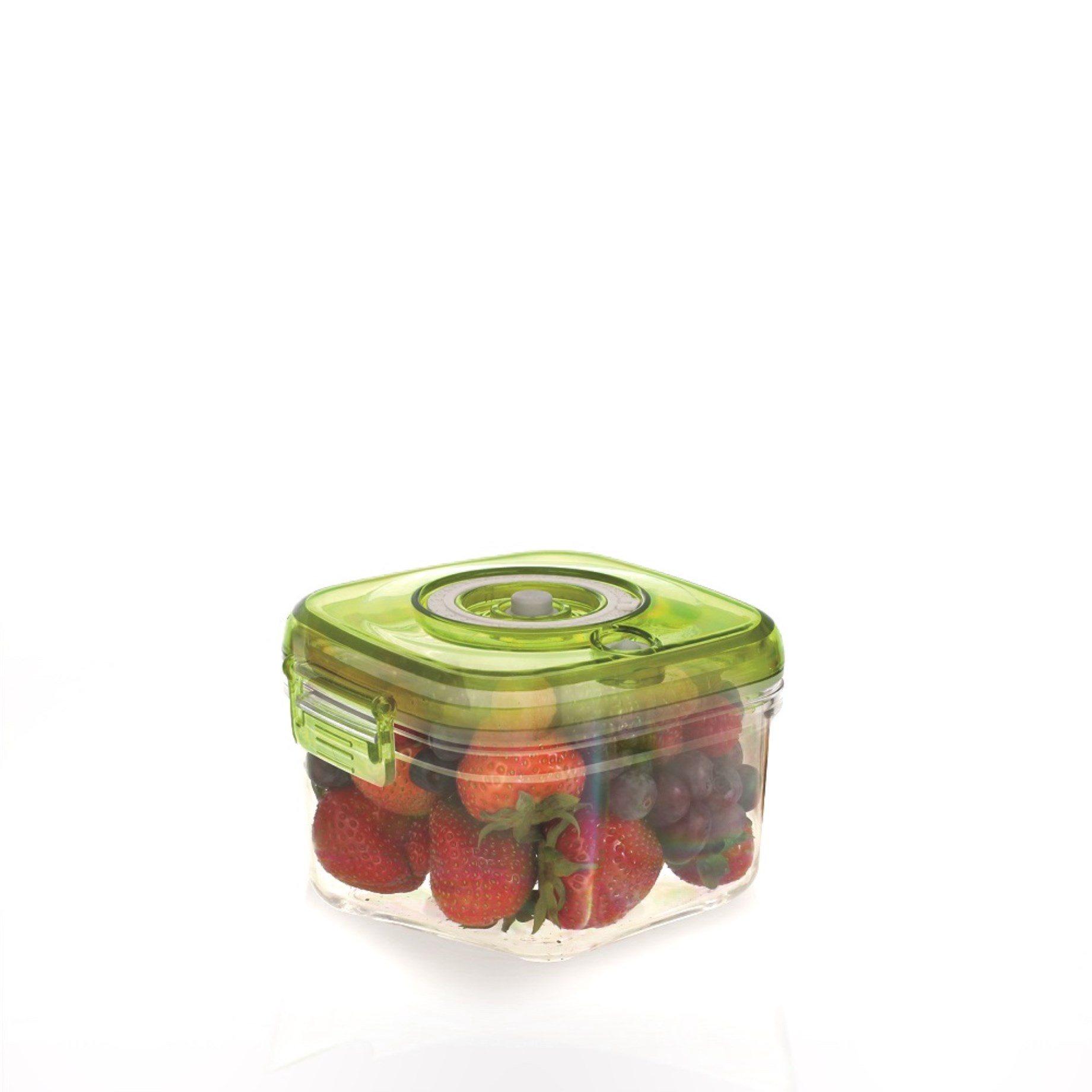 Vacucrafts innovative beholder Firkantet + Pumpe skaber vakuum, der forhindrer bakterievækst og bevarer madens smag og næringsstoffer, hvilket kan forlænge holdbarheden op til fem gange og reducere madspild. De er fremstillet af BPA-fri Tritan-plast, tåler opvaskemaskine og mikrobølgeovn (uden låg) og har en datovisning for nemt overblik. Beholderen fås i to størrelser.