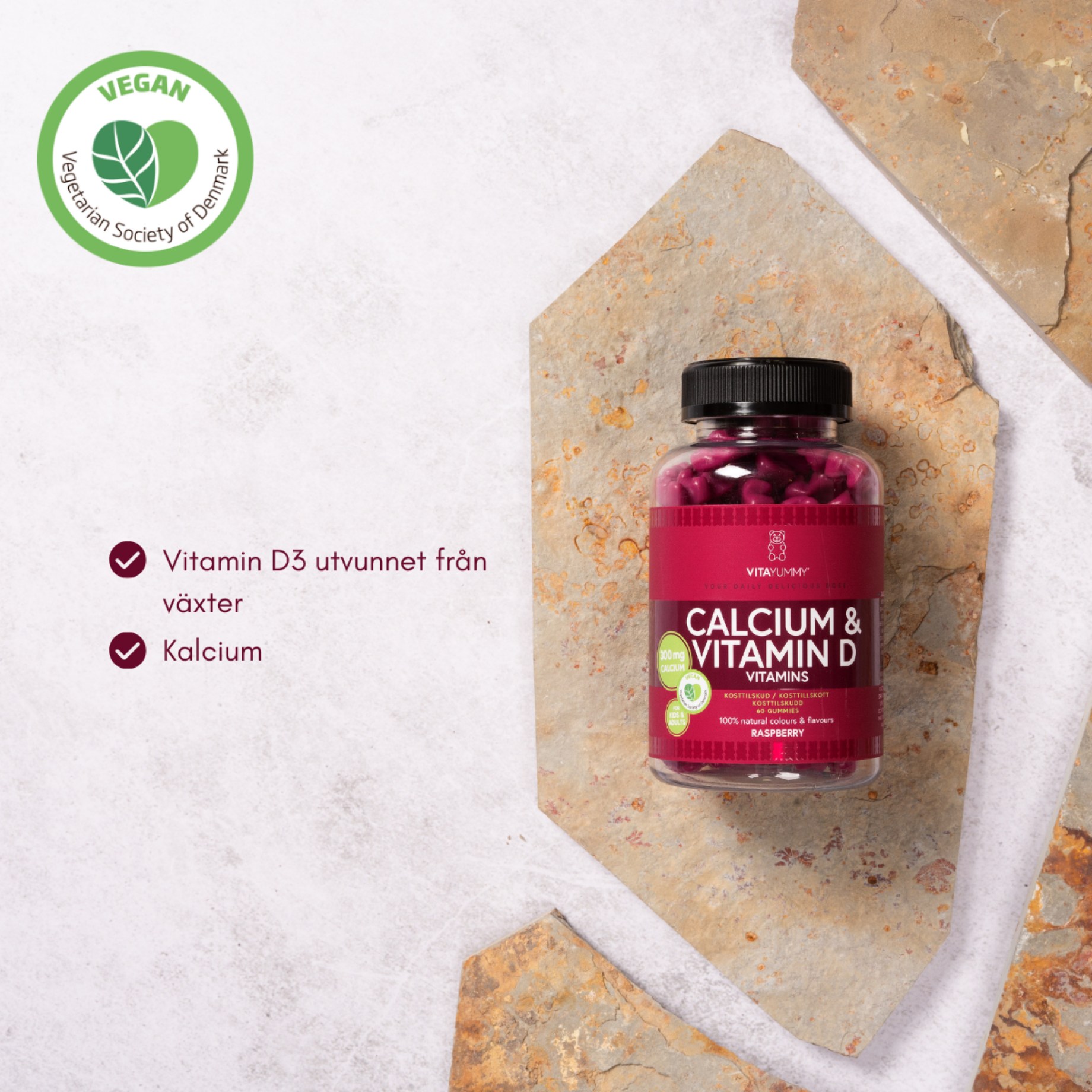VitaYummy Calcium & Vitamin D er gummies med hindbærsmag, som indeholder calcium og D-vitamin. Calcium bidrager til at vedligeholde normale knogler og tænder samt til en normal muskelfunktion. D-vitamin bidrager til en normal optagelse af calcium i kroppen. Disse gummies passer til både voksne og børn, og især til dem, der ikke får nok gennem kosten eller ikke drikker mælk. Vegansk og fri for kunstige farver, smagsstoffer og sødestoffer.