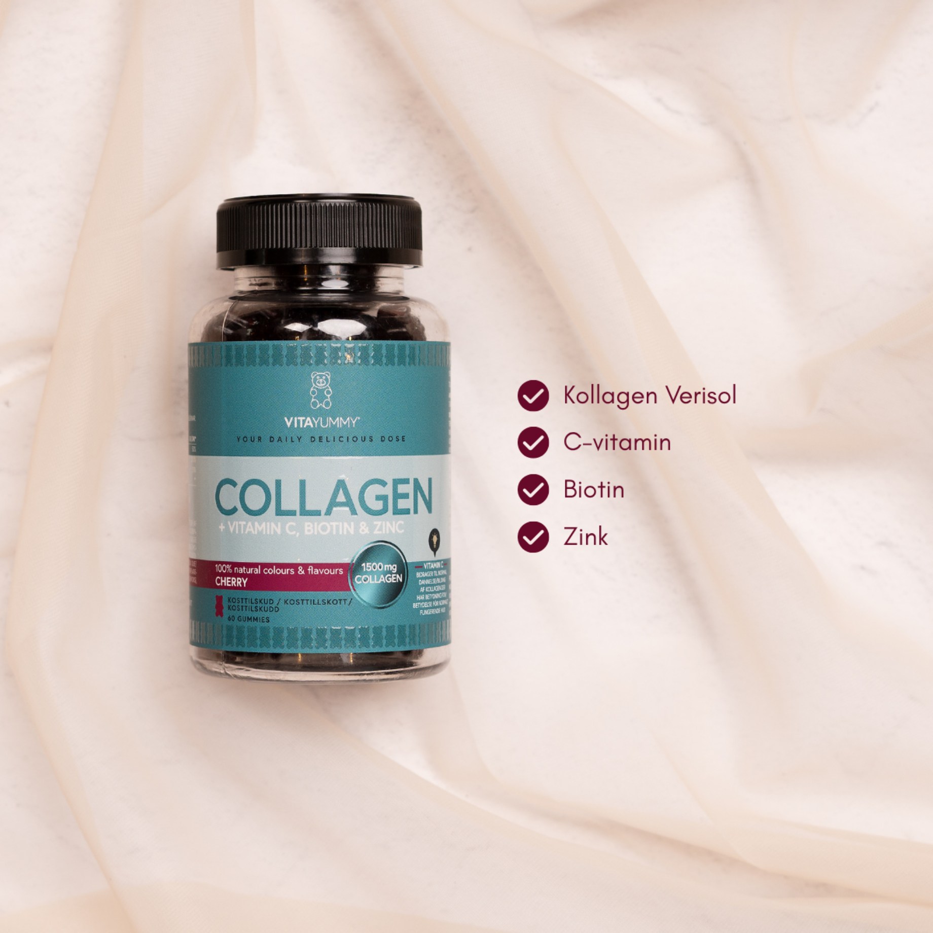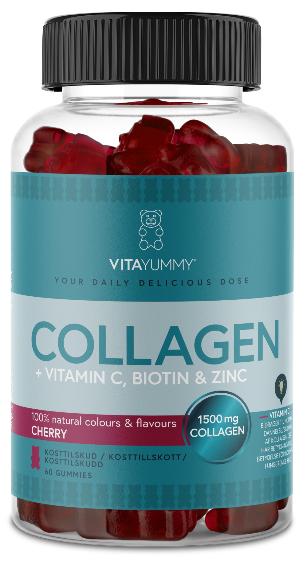 VitaYummy Collagen gør det nemt at supplere kollagen i hverdagen i form af velsmagende vingummier. Den daglige dosis giver 1500 mg hydrolyseret kollagen fra Verisol®, kombineret med vitamin C, som bidrager til normal kollagendannelse, samt biotin og zink, der bidrager til at vedligeholde normal hud.