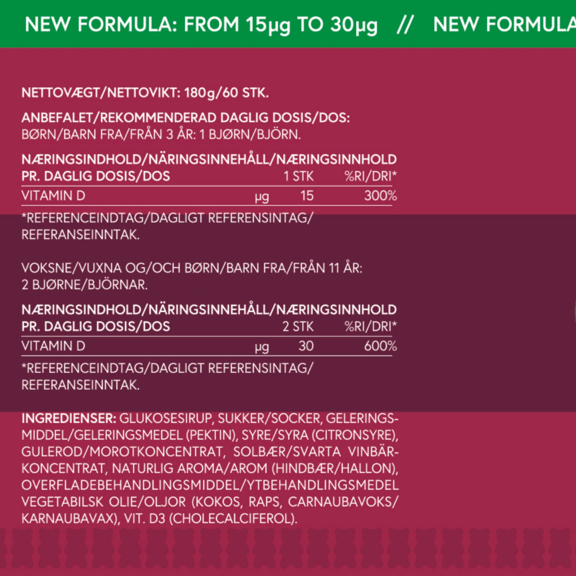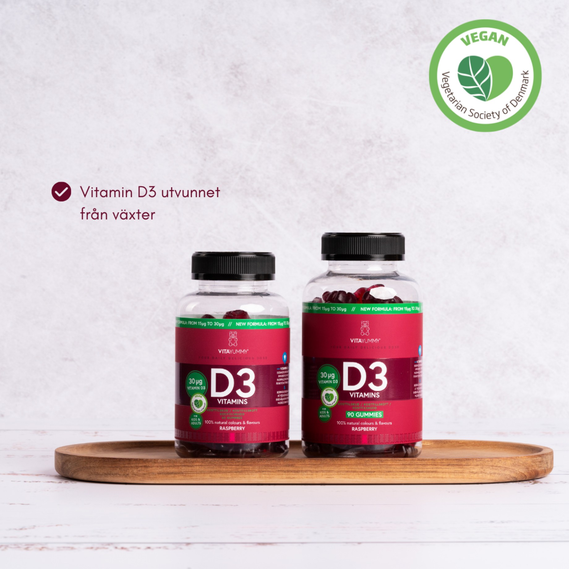 VitaYummy D3 er plantebaserede gummies med vitamin D3, som kan tages af både voksne og børn fra 3 år. Hver vingummi giver 15 mcg vitamin D3. For voksne svarer to stykker til 30 mcg om dagen, mens én er nok til små børn. Den gode smag kommer fra hindbær, og farven er ligeledes naturligt udvundet fra gulerod og solbær. Derudover er VitaYummy D3 vegansk og uden kunstige farvestoffer, aromaer eller sødemidler.