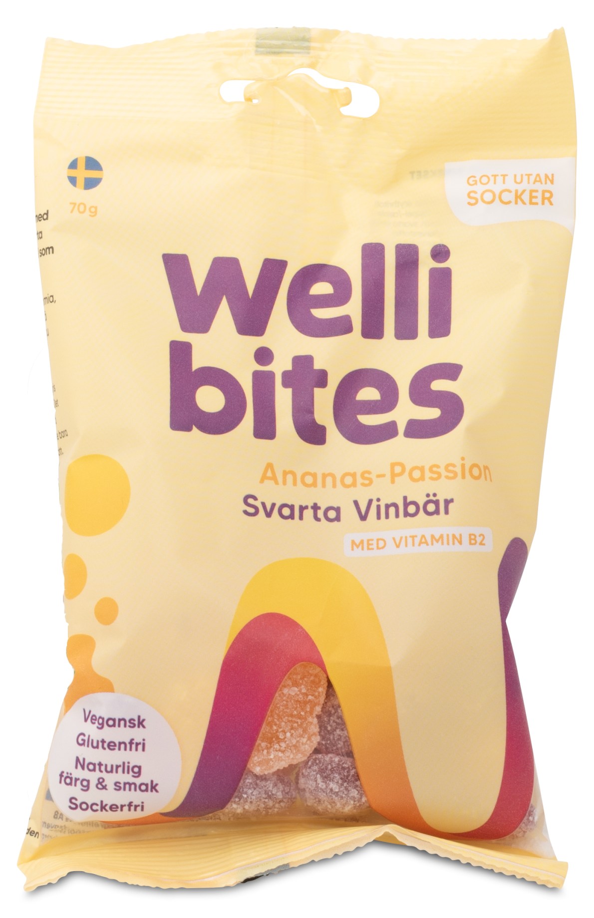 Wellibites Ananas-Passion & Solbær er en gelé slik, der er sukkerfri og vegansk. Smag og farve er naturlig fra frugt og grønt. Uimodståeligt god og velsmagende med 40% færre kalorier end almindeligt slik. Smagen af ananas-passion og solbær smager tropisk og frisk og er også beriget med vitamin B2. Fri for gluten og palmeolie. Nyd sund og lækker slik!